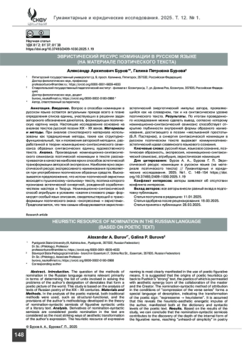 4. Буров А. А., Бурова Г. П. Эпитет в поэтическом тексте А.С. Пушкина: семиозис синтаксической номинации // Вестник Пятигорского государственного университета. 2024. № 1. C. 4654.