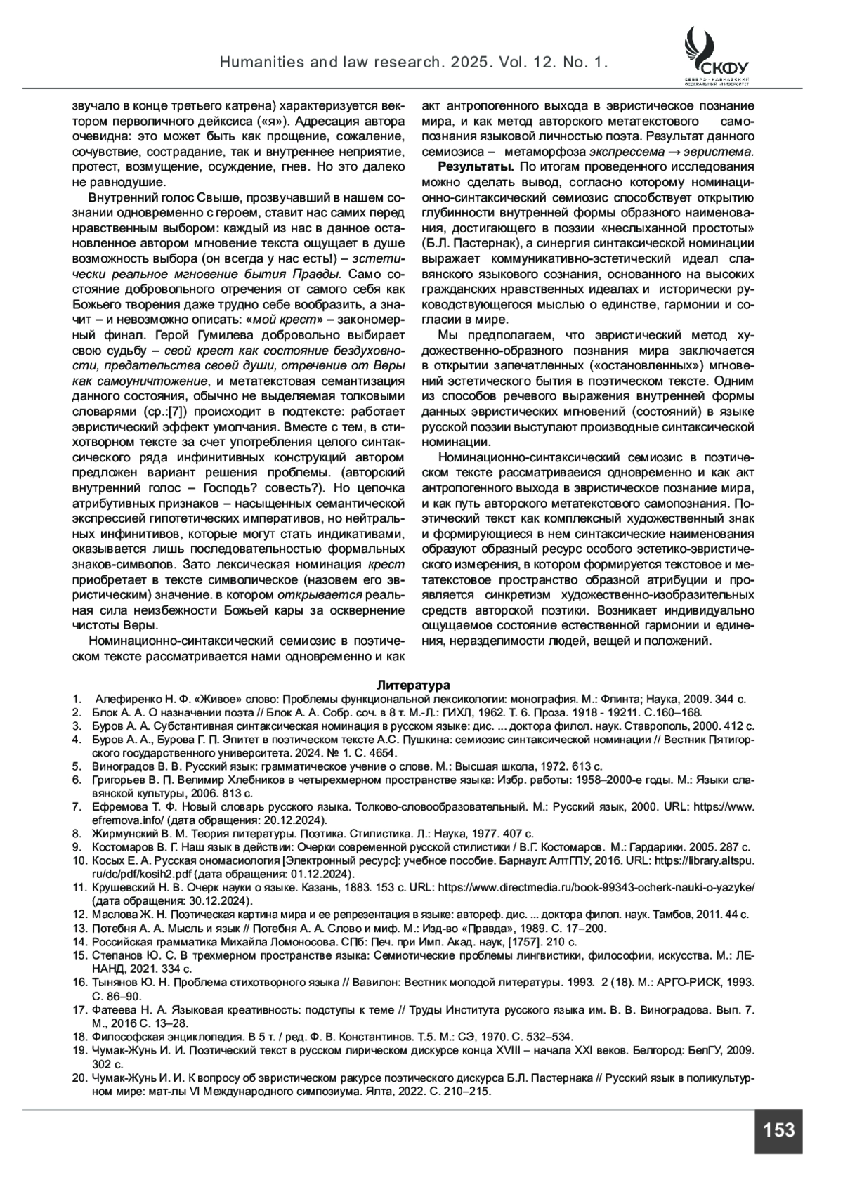 Результаты. По итогам проведенного исследования можно сделать вывод, согласно которому номинационно-синтаксический семиозис способствует открытию глубинности внутренней формы образного наименования, достигающего в поэзии «неслыханной простоты» (Б. Л. Пастернак), а синергия синтаксической номинации в русском поэтическом тексте выражает коммуникативноэстетический идеал славянского языкового сознания.
