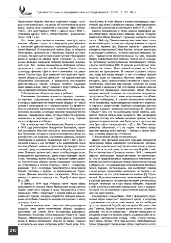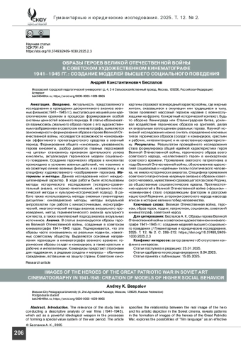 Анализ. В статье анализируются образы героев Великой Отечественной войны, созданные в советском кинематографе 1941–1945 годов. Подчеркивается, что эти образы часто основывались на реальных подвигах, известных советскому обществу. Выделяются основные направления героизации в кинематографе военного времени: героические образы солдат и командиров, а также крестьян и рабочих и интеллигенции. Командиры предстают эталонами для подражания, а рядовые солдаты и матросы – обычными гражданами, вставшими на защиту страны. Советские кинокартины отражают всенародный характер войны, где мирные жители, оказавшиеся в оккупации или трудящиеся в тылу, также проявляют массовый героизм наравне с военнослужащими на фронте. Конкретный исторический контекст, будь то оборона Ленинграда или Сталинградская битва, усиливал воздействие героических образов на зрителей, делая их визуальным воплощением реальных героев. Научной новизной исследования можно считать определение ключевых типов героических образов (солдат и командиров, крестьян и рабочих, интеллигенции) и их качественную характеристику.