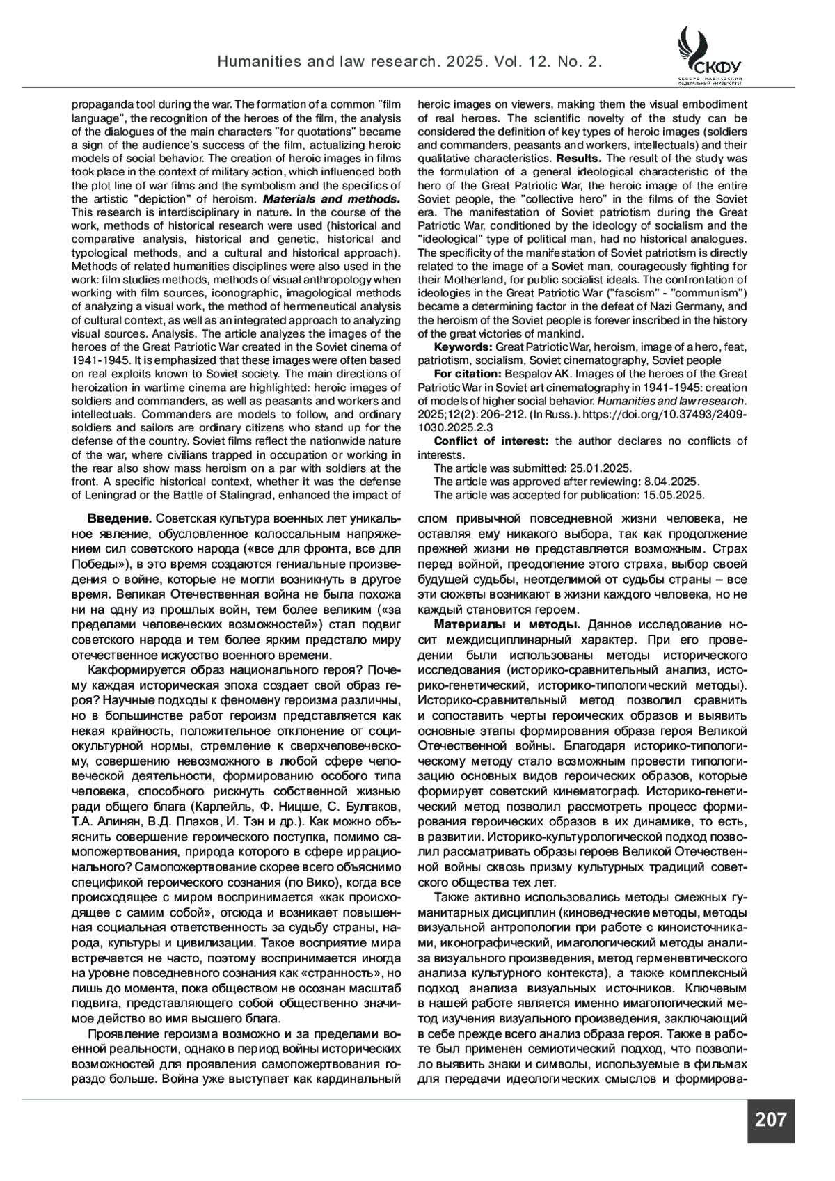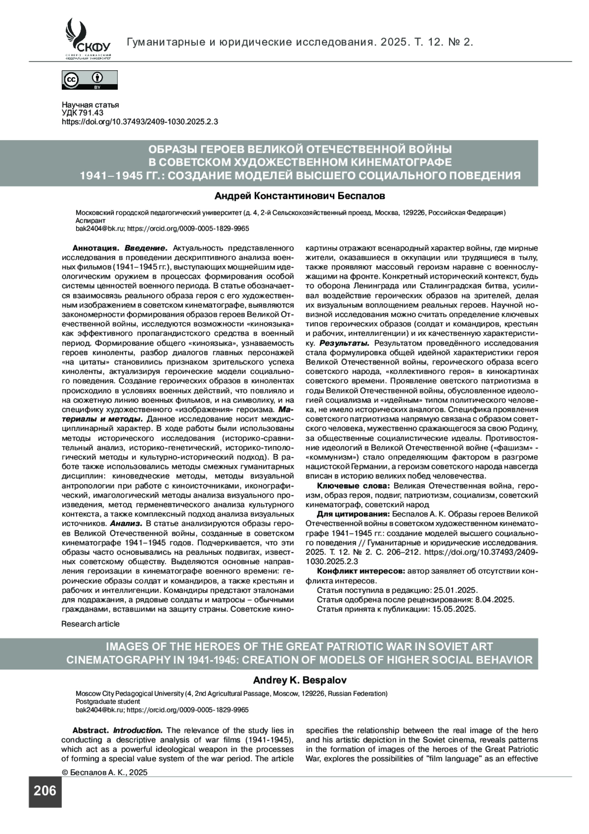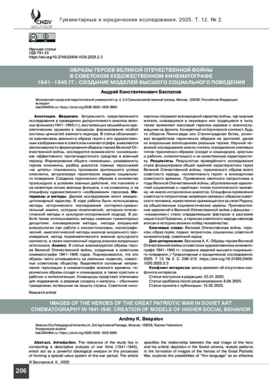 Введение. Актуальность представленного исследования в проведении дескриптивного анализа военных фильмов (1941–1945 гг.), выступающих мощнейшим идеологическим оружием в процессах формирования особой системы ценностей военного периода. В статье обозначается взаимосвязь реального образа героя с его художественным изображением в советском кинематографе, выявляются закономерности формирования образов героев Великой Отечественной войны, исследуются возможности «киноязыка» как эффективного пропагандистского средства в военный период. Формирование общего «киноязыка», узнаваемость героев киноленты, разбор диалогов главных персонажей «на цитаты» становились признаком зрительского успеха киноленты, актуализируя героические модели социального поведения. Создание героических образов в кинолентах происходило в условиях военных действий, что повлияло и на сюжетную линию военных фильмов, и на символику, и на специфику художественного «изображения» героизма.