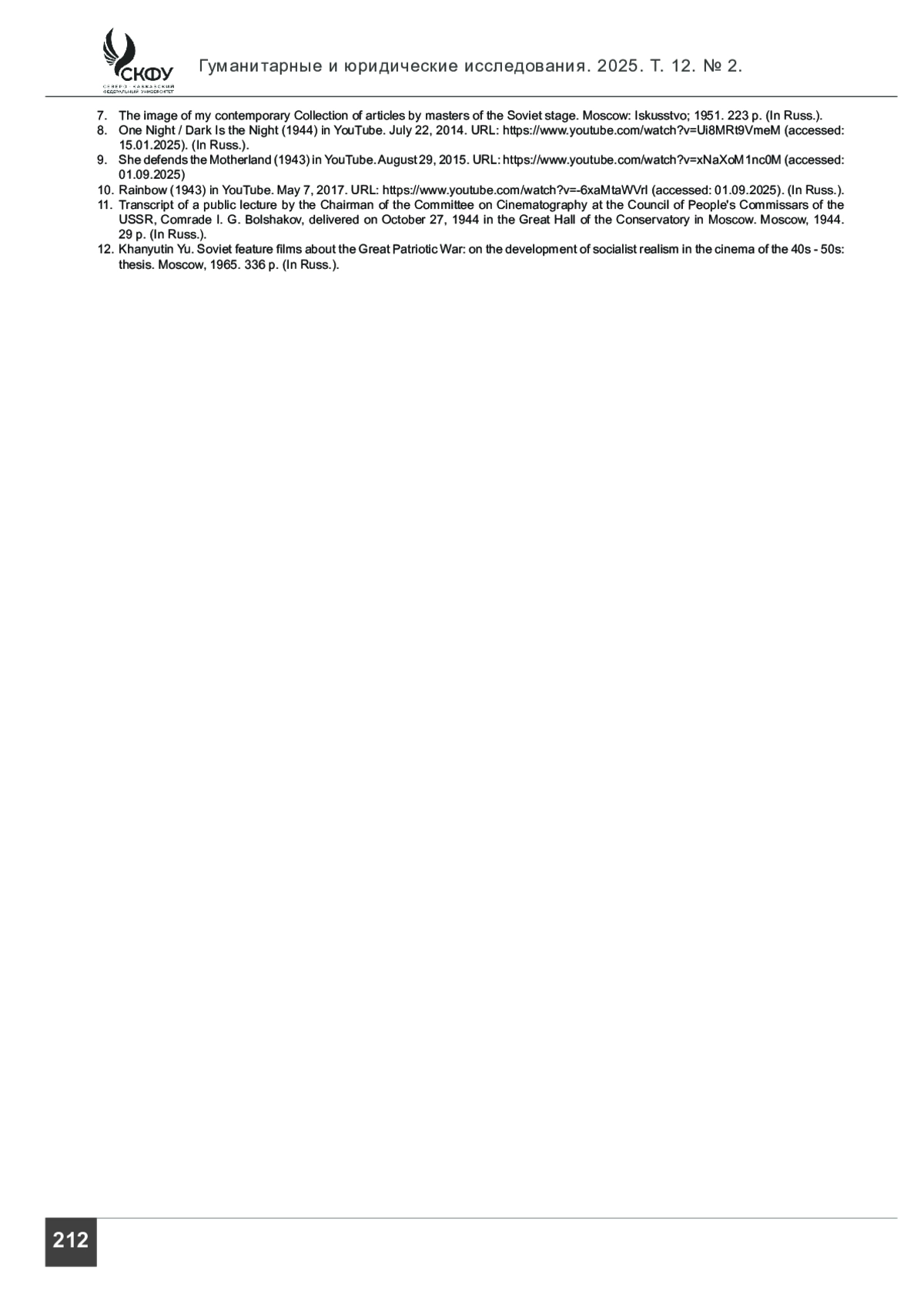 12. Ханютин Ю. Советские художественные фильмы о Великой Отечественной войне: к вопросу о развитии социалистического реализма в киноискусстве 40-х - 50-х годов: диссертация… кандидата искусствоведения. М.: б.и., 1965. 336 с.