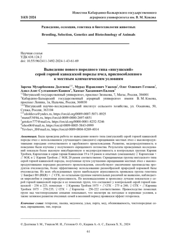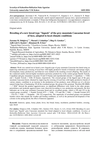 Была проведена работа по выведению нового типа (ингушский) серой горной кавказской породы пчел с использованием улучшающего (вводного) скрещивания местных пчел с высокопродуктивными породами отечественного и зарубежного происхождения. Развитие, медопродуктивность и поведение были изучены у полученного скрещенного потомства. Результаты проведенных исследований показали более высокую инкубационную и медопродуктивность в контрольных группах Карник Тройзек, Карпатская и серая горная Кавказская 19 и 18 рамок и опытных (смешанных) ♀ Карпатская × ♂ SGK и ♀ Карник Тройзек ♂ SGK 20 рамок соответственно. Скрещиваемые группы ингушского типа серой горной кавказской породы, полученные путем улучшения скрещивания местных пчел с высокопродуктивными породами различного происхождения, способствуют увеличению производства продуктов пчеловодства, более эффективному использованию разнообразной природной кормовой базы пчеловодства. Из всех обследованных групп наибольшую агрессивность проявляла группа генотипа ♀ Бакфаст В8 (RKR) × ♂ СГК, по остальным группам значительных различий не выявлено, наблюдается миролюбие и умеренная агрессивность. По восковыделению и прополису лучшие показатели у серой горной кавказской породы и ее помесных групп, что составляет у контрольной серой горной кавказской - 256 и 223; помесных - ♀ Карника Тройзек 1075 × ♂ СГК - 275 и 240; ♀ СГК × ♂ Карника Тройзек 1075 - 270-235; ♀ СГК × ♂ Карпатка - 256-222 соответственно. Превосходство помесных групп над чистопородными семьями показывает, что несмотря на погодные и кормовые условия, а также затяжное развитие пчелиных семей в весенний период проявился эффект гетерозиса.
