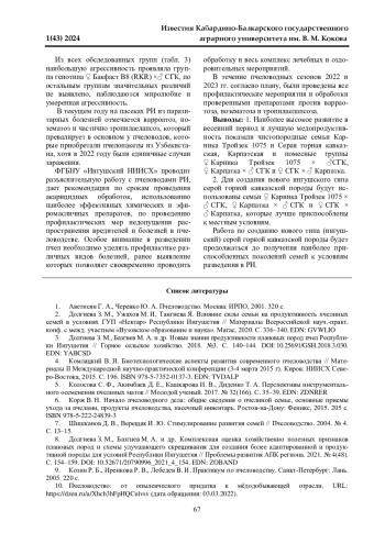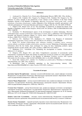 2. Долгиева З. М., Ужахов М. И, Тангиева Я. Влияние силы семьи на продуктивность пчелиных семей в условиях ГУП “Нектар” Республики Ингушетия // Материалы Всероссийской науч.-практ. конф. с межд. участием “Вузовское образование и наука”. Магас, 2020. С. 336-340. EDN: GVWLIO