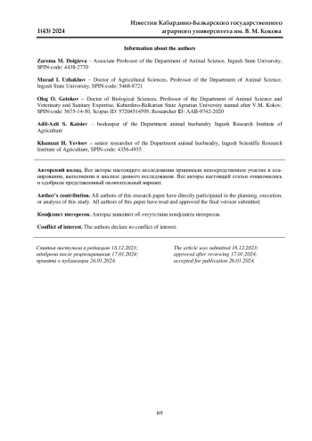 8. Долгиева З. М., Базгиев М. А. и др. Комплексная оценка хозяйственно полезных признаков плановых пород и схемы улучшающего скрещивания для создания более адаптированной и продуктивной породы для условий Республики Ингушетия // Проблемы развития АПК региона. 2021. № 4(48). С. 154-159. DOI: 10.52671/20790996_2021_4_154 EDN: ZOBAND