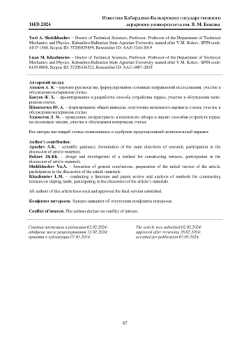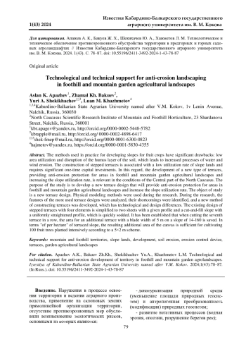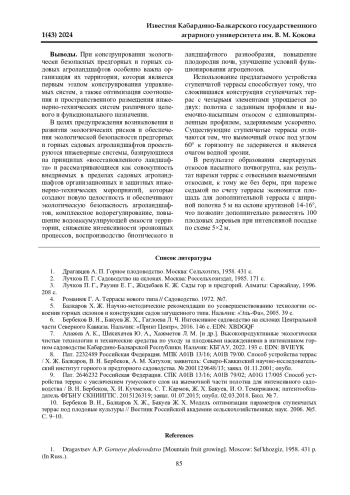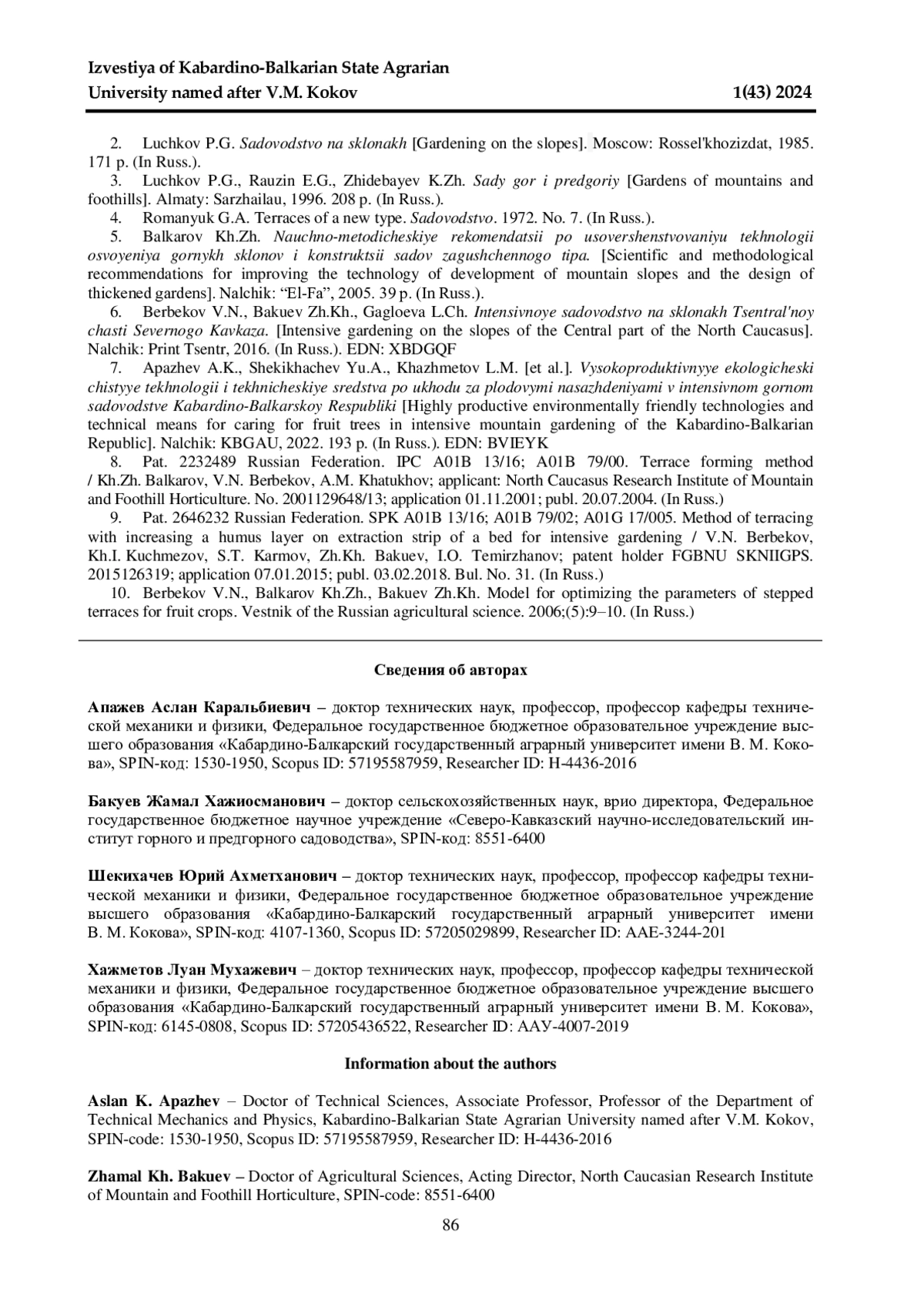 10. Бербеков В. Н., Балкаров Х. Ж., Бакуев Ж. Х. Модель оптимизации параметров ступенчатых террас под плодовые культуры // Вестник Российской академии сельскохозяйственных наук. 2006. №5. С. 9-10.
