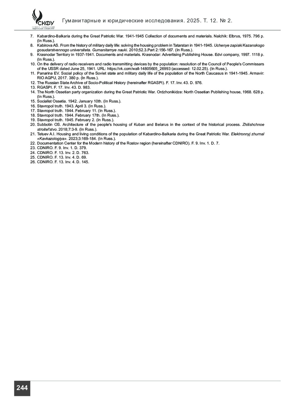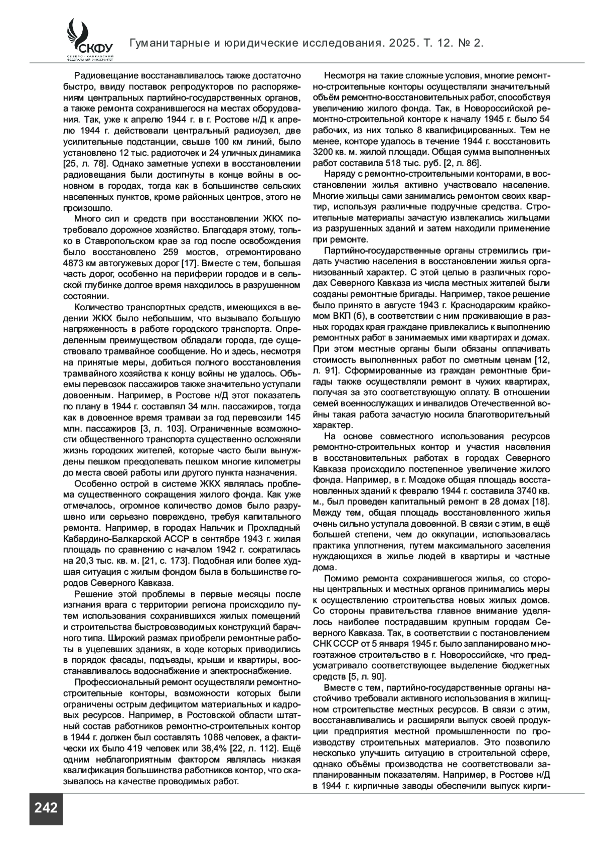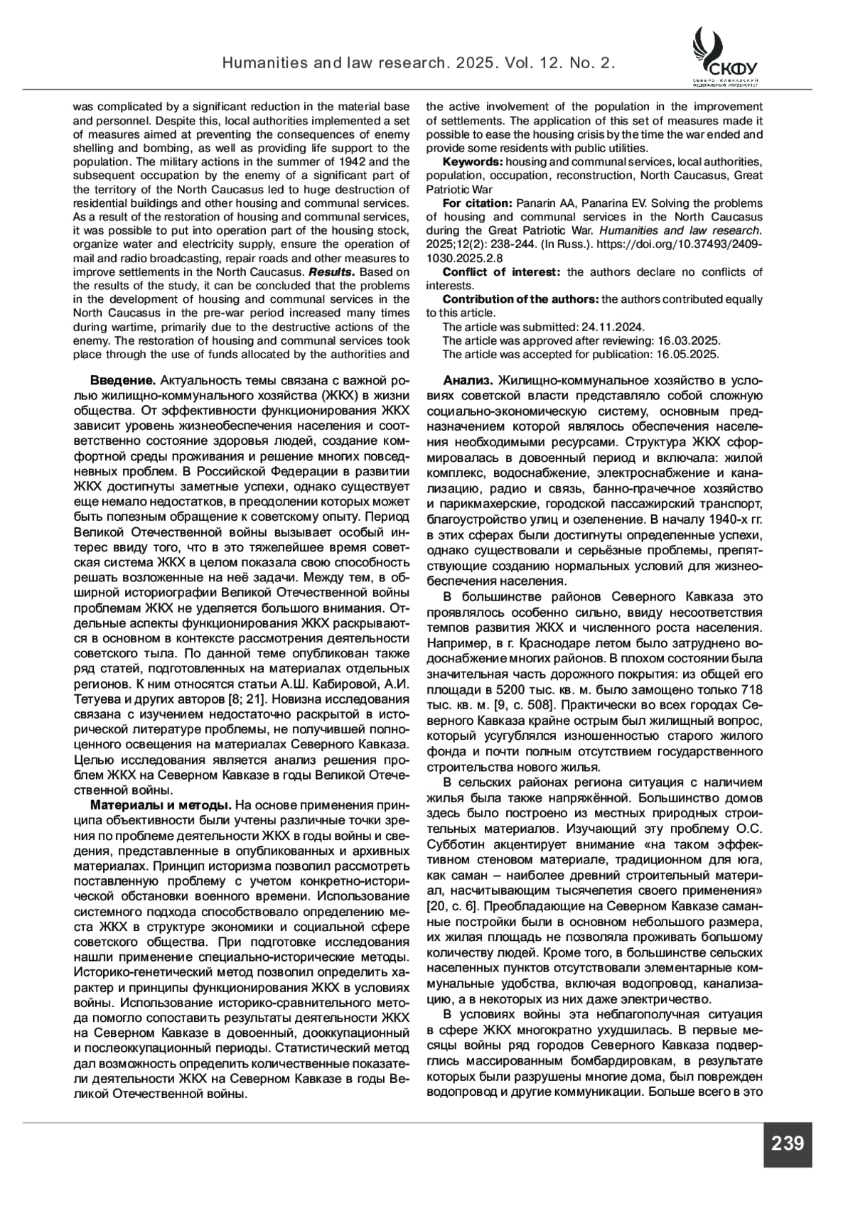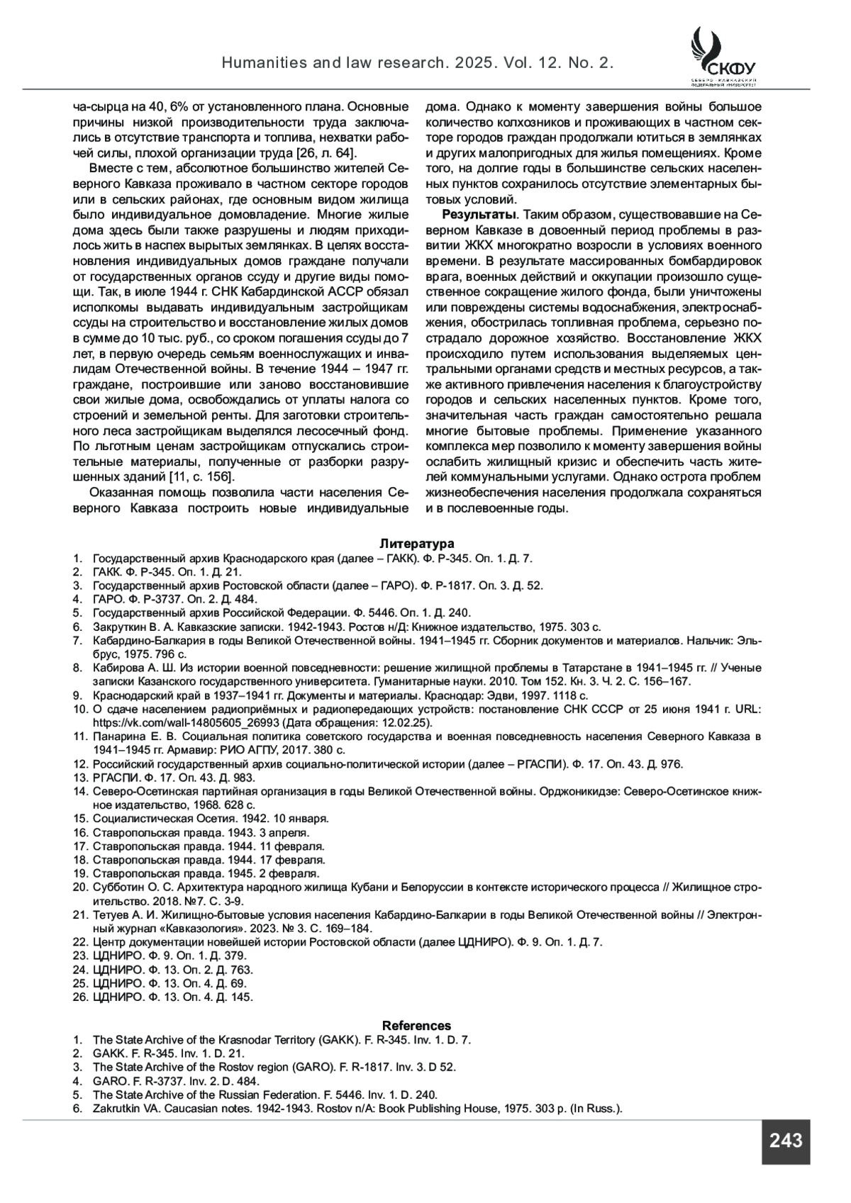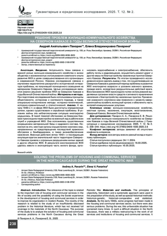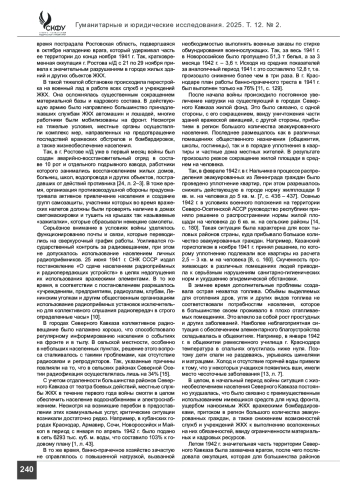ПАНАРИН А. А., ПАНАРИНА Е. В. РЕШЕНИЕ ПРОБЛЕМ ЖИЛИЩНО-КОММУНАЛЬНОГО ХОЗЯЙСТВА НА СЕВЕРНОМ КАВКАЗЕ В ГОДЫ ВЕЛИКОЙ ОТЕЧЕСТВЕННОЙ ВОЙНЫ // ГУМАНИТАРНЫЕ И ЮРИДИЧЕСКИЕ ИССЛЕДОВАНИЯ. 2025. ТОМ 12, № 2