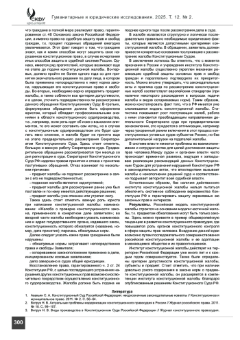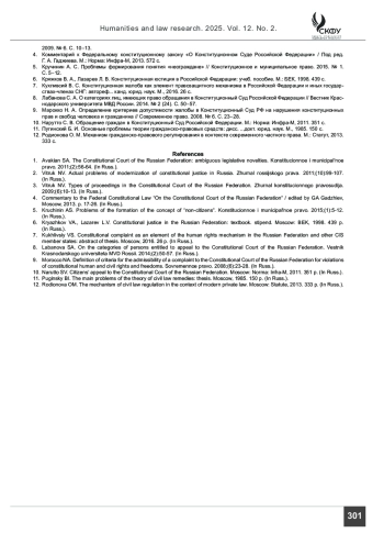 1. Авакьян С. А. Конституционный Суд Российской Федерации: неоднозначные законодательные новеллы // Конституционное и муниципальное право. 2011. № 2. С. 56-64.