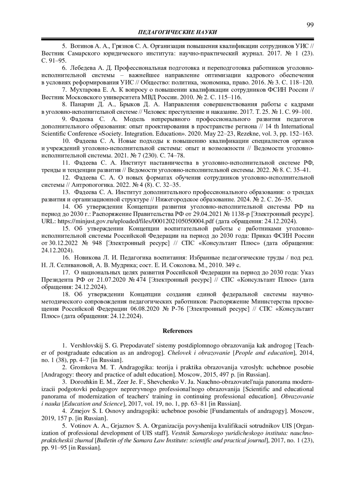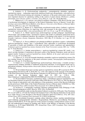 10. Фадеева С. А. Новые подходы к повышению квалификации специалистов органов и учреждений уголовно-исполнительной системы: опыт и возможности // Ведомости уголовно-исполнительной системы. 2021. № 7 (230). С. 74-78. EDN: ETHXQG