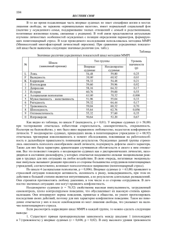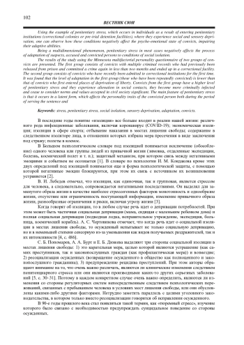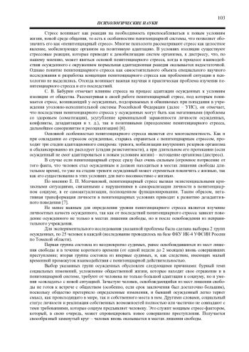 Приводятся результаты исследования с помощью Миннесотского многофакторного личностного опросника двух групп осужденных. Первая группа - осужденные, имеющие несколько судимостей, которые перед этим были освобождены из мест лишения свободы и в срок менее двух месяцев снова совершили преступление и попали в исправительное учреждение. Вторая группа - осужденных, которые недавно в первый раз попали в исправительные учреждения. Установлено, что уровень адаптации в первой группе (неоднократно судимые) ниже, чем у осужденных, впервые попавших в места лишения свободы. У осужденных из первой группы выше уровень пенитенциарного стресса и у них отмечается отчужденность в социальных контактах, они становятся более криминально зараженными и перестают считать значимыми нормы и ценности, принятые в гражданском обществе. Главной особенностью пенитенциарного стресса является то, что он протекает в латентной форме, что сказывается на качествах личности осужденного как в период отбывания наказания, так и после освобождения.