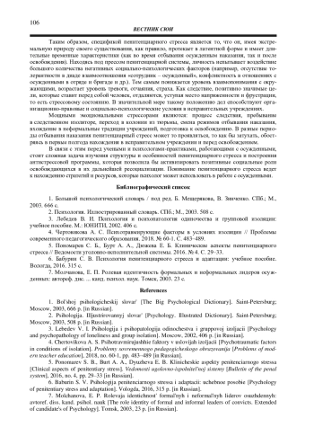 5. 	Пономарев С. Б., Бурт А. А., Дюжева Е. Б. Клинические аспекты пенитенциарного стресса // Ведомости уголовно-исполнительной системы. 2016. № 4. С. 29-33. EDN: WHGTPP