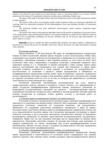 Актуальность темы обусловлена пробелами в правовом регулировании некоторых аспектов реализации универсального конституционного права на квалифицированную юридическую помощь лиц, содержащихся под стражей, а также особенностей его имплементации в производстве по уголовным делам.