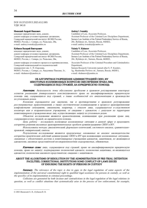 ИВЕНСКИЙ А. И., КУБАНОВ В. В. ОБ АЛГОРИТМАХ РАЗРЕШЕНИЯ АДМИНИСТРАЦИЕЙ СИЗО, ИУ НЕКОТОРЫХ КОЛЛИЗИОННЫХ ВОПРОСОВ ОБЕСПЕЧЕНИЯ ПРАВА ЛИЦ, СОДЕРЖАЩИХСЯ ПОД СТРАЖЕЙ, НА ЮРИДИЧЕСКУЮ ПОМОЩЬ // ВЕСТНИК САМАРСКОГО ЮРИДИЧЕСКОГО ИНСТИТУТА. 2025. № 2 (63)