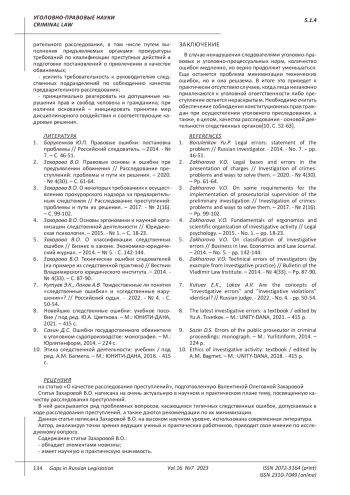 5. Захарова В.О. О классификации следственных ошибок // Бизнес в законе. Экономико-юридический журнал. - 2014. - № 5. - С. 142-144. EDN: TUUJQP