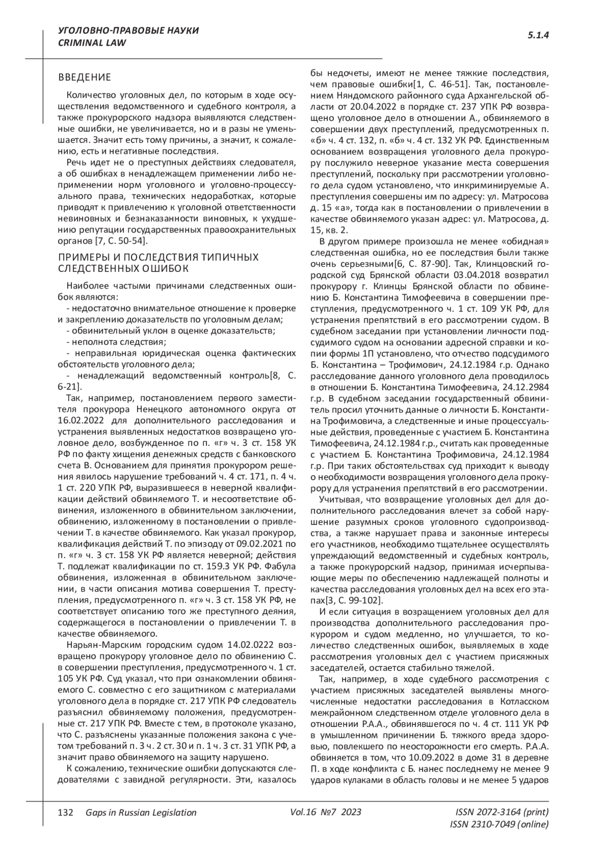 7. Кутуев Э.К., Лаков А.В. Тождественные ли понятия “следственные ошибки” и “следственные нарушения”? // Российский судья. - 2022. - № 4. - С. 50-54. EDN: UMGOWI