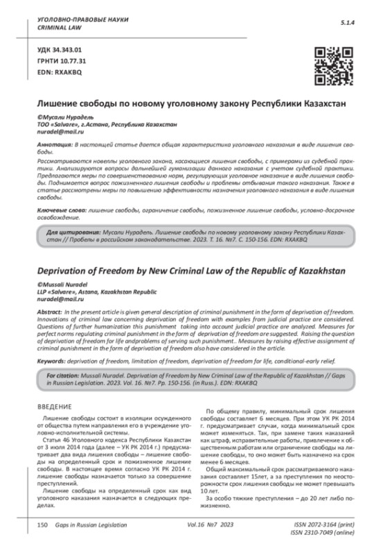 Nurseitova T. Deprivation of freedom is widespread punishment // Lawyer. 2004. №10.