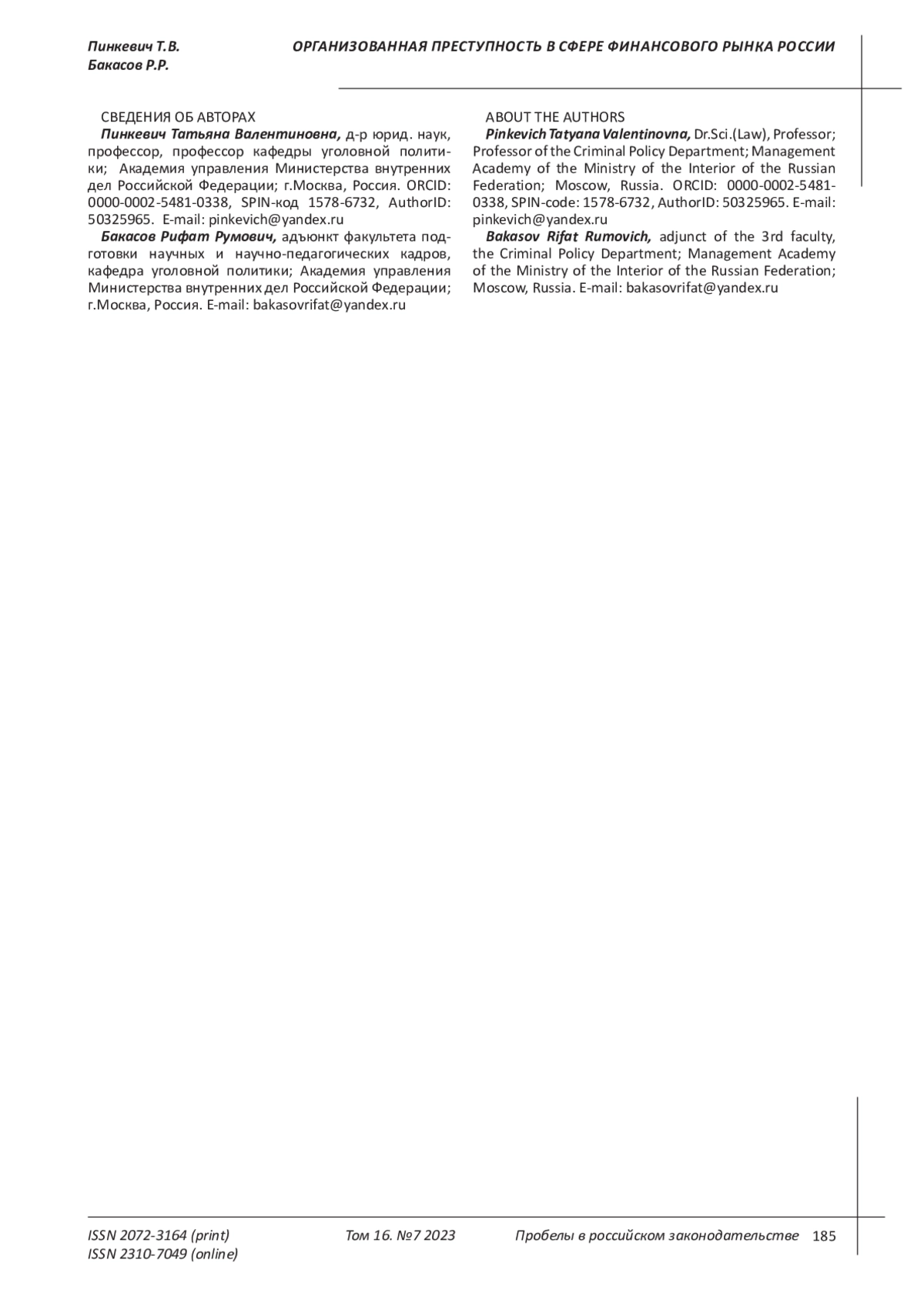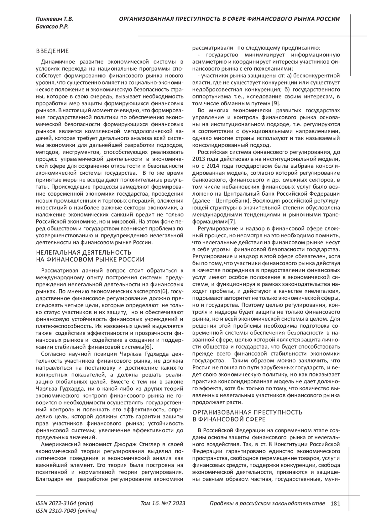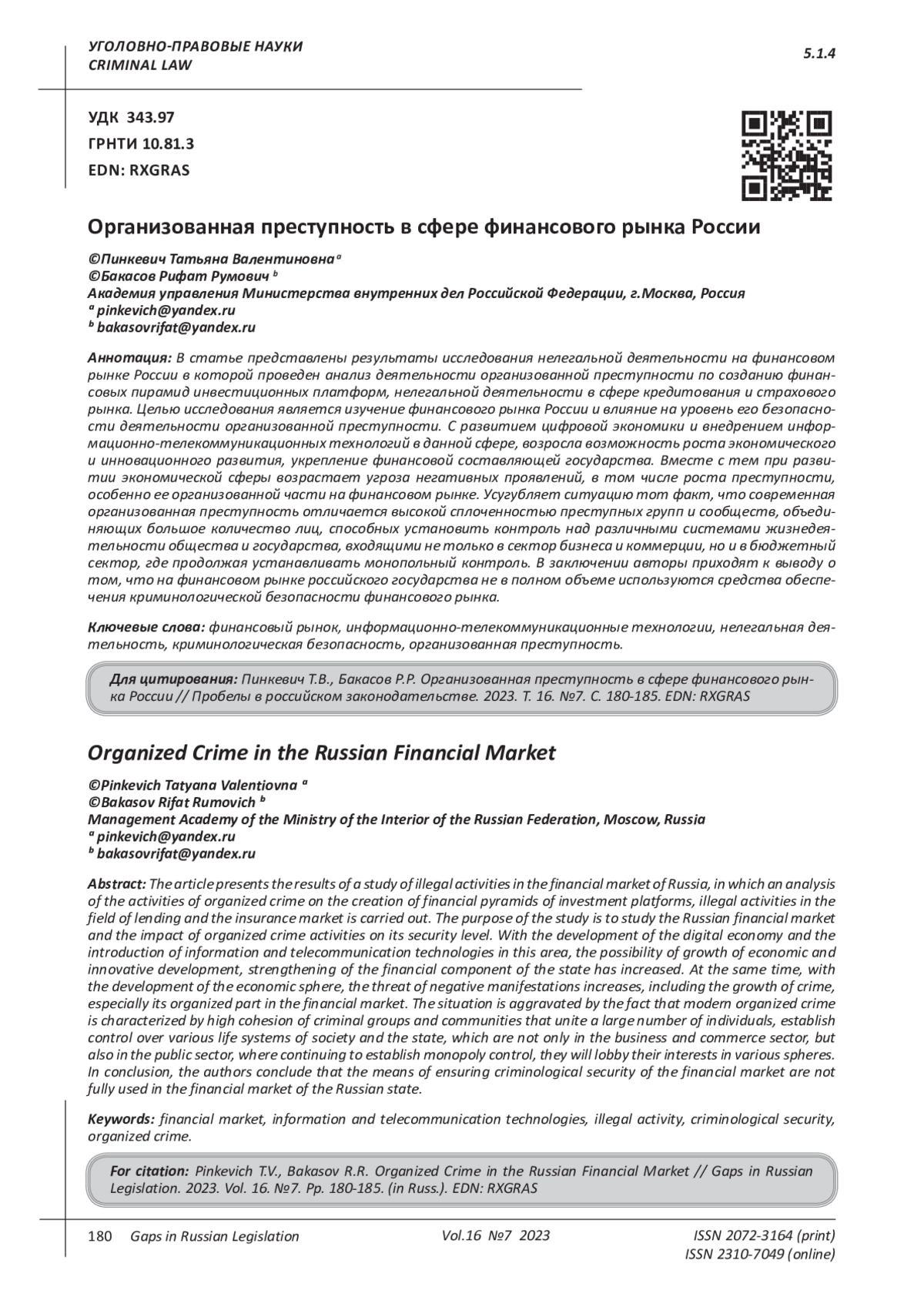 В статье представлены результаты исследования нелегальной деятельности на финансовом рынке России в которой проведен анализ деятельности организованной преступности по созданию финансовых пирамид инвестиционных платформ, нелегальной деятельности в сфере кредитования и страхового рынка. Целью исследования является изучение финансового рынка России и влияние на уровень его безопасности деятельности организованной преступности. С развитием цифровой экономики и внедрением информационно-телекоммуникационных технологий в данной сфере, возросла возможность роста экономического и инновационного развития, укрепление финансовой составляющей государства. Вместе с тем при развитии экономической сферы возрастает угроза негативных проявлений, в том числе роста преступности, особенно ее организованной части на финансовом рынке. Усугубляет ситуацию тот факт, что современная организованная преступность отличается высокой сплоченностью преступных групп и сообществ, объединяющих большое количество лиц, способных установить контроль над различными системами жизнедеятельности общества и государства, входящими не только в сектор бизнеса и коммерции, но и в бюджетный сектор, где продолжая устанавливать монопольный контроль. В заключении авторы приходят к выводу о том, что на финансовом рынке российского государства не в полном объеме используются средства обеспечения криминологической безопасности финансового рынка.