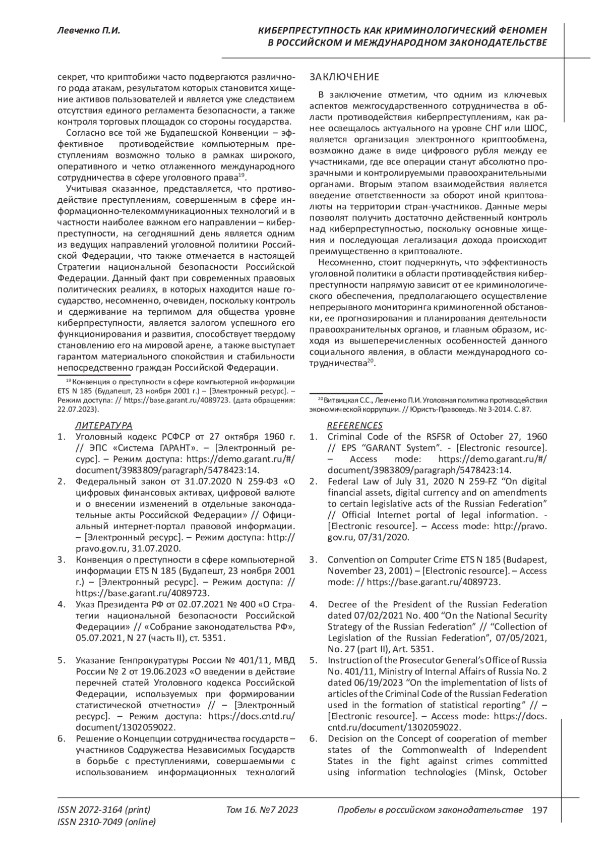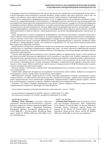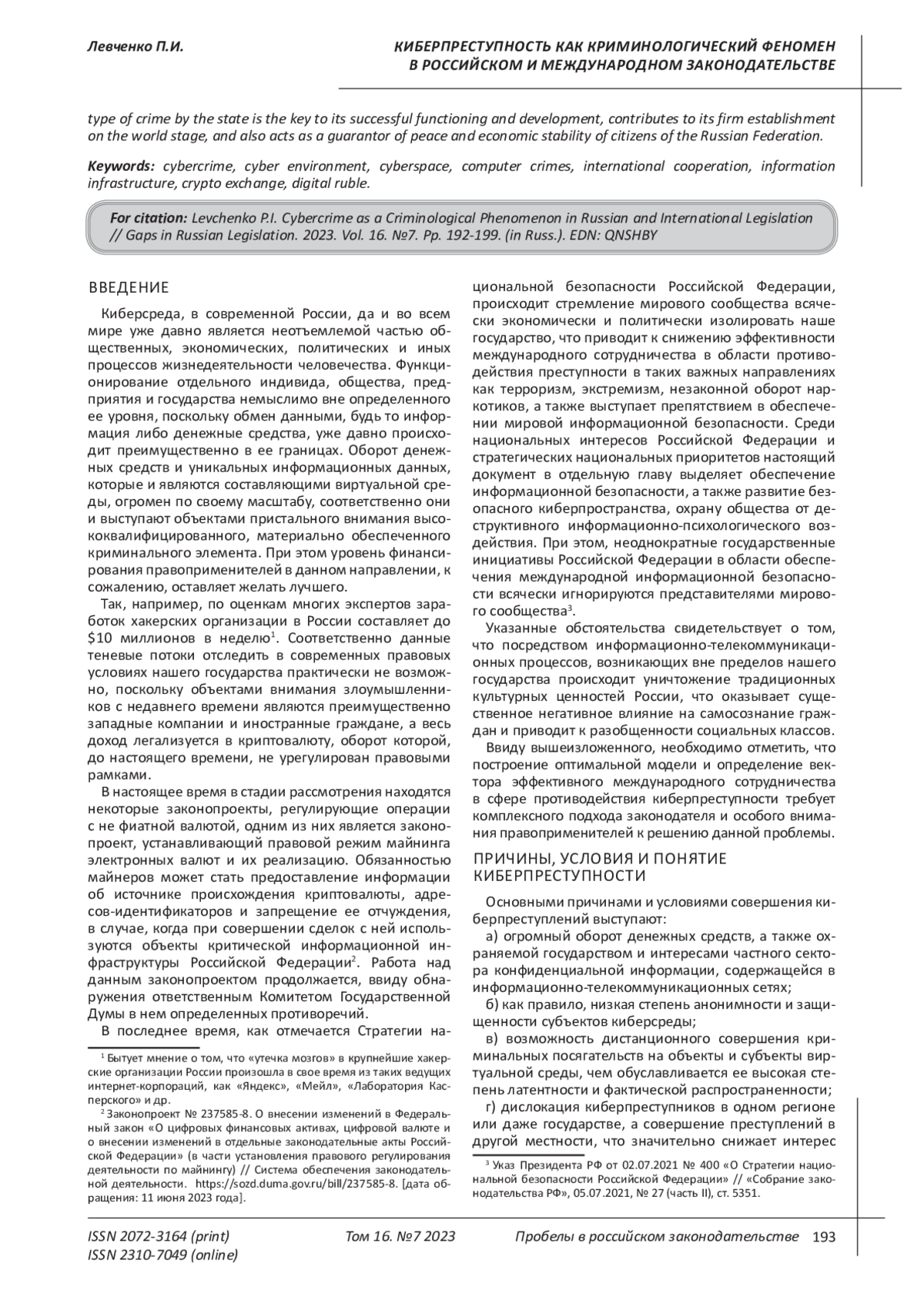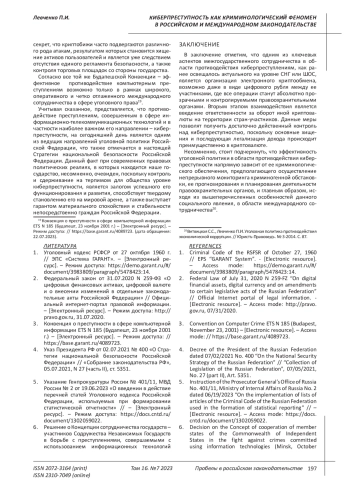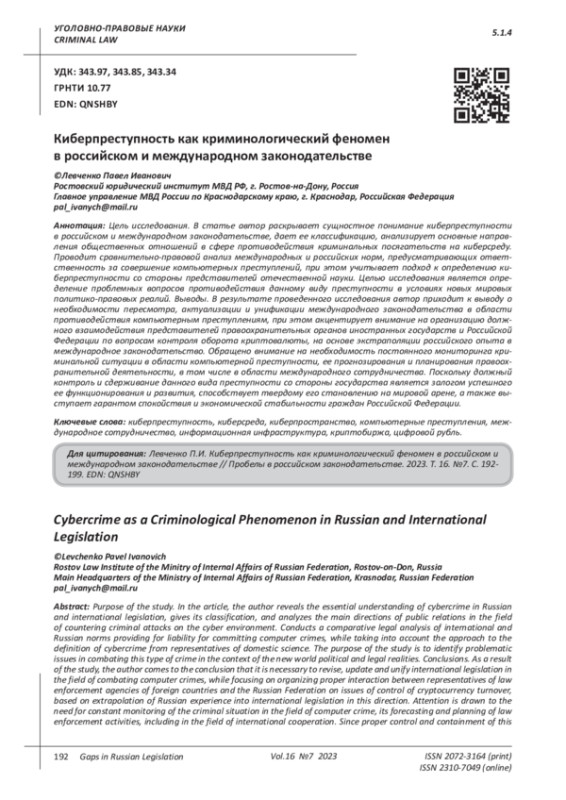 ЛЕВЧЕНКО П. И. КИБЕРПРЕСТУПНОСТЬ КАК КРИМИНОЛОГИЧЕСКИЙ ФЕНОМЕН В РОССИЙСКОМ И МЕЖДУНАРОДНОМ ЗАКОНОДАТЕЛЬСТВЕ // ПРОБЕЛЫ В РОССИЙСКОМ ЗАКОНОДАТЕЛЬСТВЕ. 2023. Т. 16 № 7 (42 СТ.)