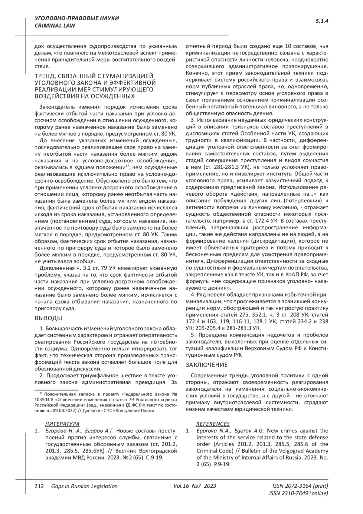 2. Лопашенко, Н. А. Основные итоги реформирования уголовного законодательства в 2022 г.: аналитический обзор / Н. А. Лопашенко // Lex Russica (Русский закон). - 2023. - Т. 76, № 4(197). - С. 115-135. DOI: 10.17803/1729-5920.2023.197.4.115-135 EDN: BJPGBV ▼ Контекст