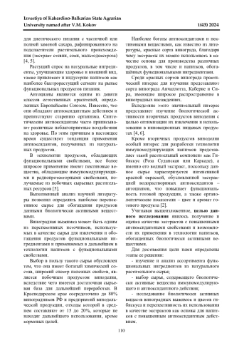 В современном мире образ жизни и рацион населения в значительной степени изменился. Такие изменения повлияли и на здоровье, выносливость, трудоспособность и эмоциональное состояние людей. В первую очередь на состояние здоровья людей влияет пищевой рацион, поскольку с пищей человек потребляет все необходимые и жизненно важные микро- и макроэлементы. Антиоксидантные фенольные соединения и пектиновые вещества растений привлекают все больше внимания в качестве объекта исследования, так как они обладают антиоксидантными и иммуномодулирующими свойствами при регулярном употреблении. В связи с этим целью исследований явилось изучение растительного сырья с повышенными антиоксидантными свойствами, используемого для применения в производстве функциональных напитков. Объекты изучения биологически активных соединений - виноградные выжимки красных сортов винограда и цветки гибискуса. Определены физико-химические показатели сырья, подтверждающие высокое содержание пектиновых веществ в виноградных выжимках, в среднем по сортам - 3,77%, полифенольных веществ - 3227,83 мг/дм3. У гибискуса содержание полифенолов составило 1227,2 мг/дм3. Установленные данные подтверждают технологические свойства сырья для получения экстрактов. Экстракты получали методом кислотного и водного гидролиза. Установлено, что при экстракции потери биологически активных веществ незначительны, органолептическая оценка показала привлекательность экстрактов для будущих напитков. Предложенное сырье можно рекомендовать для производства экстрактов, используемых в качестве основы для напитков с повышенными антиоксидантными и радиопротекторными свойствами.