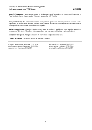 Данная работа посвящена выявлению изменений физико-химических показателей полуфабрикатов и ликероводочных изделий при обработке их холодом и оклеивающими веществами. Исследования проводились в условиях ООО «Эльбрус Спиритс» и на кафедре «Технология производства и переработки сельскохозяйственной продукции» Кабардино-Балкарского ГАУ в 2021-2023 гг. В качестве объектов исследований служили морсы и соки, выработанные из рябины, яблок и брусники. Спиртованные плодово-ягодные морсы и соки обрабатывали холодом при температурах: минус 3 + минус 6°С. Пробная обработка спиртованных соков показала, что оптимальная доза поливинилпирролидона (ПВП) для рябинового и брусничного соков составляет 200 мг/л, яблочного - 20 мг/л. Установлено, что при обработке ПВП и бентонитом значительно снижается количество фенольных веществ сока. При обработке спиртованных соков по данной схеме не наблюдалось заметного изменения содержания пектиновых веществ. Для предупреждения коллоидных помутнений рекомендованы следующие виды обработок: обработка холодом, заключающаяся в охлаждении полуфабрикатов или купажа до температуры (минус 3 + минус 6°С) и выдержка при этой температуре до 48 ч с последующей фильтрацией на холоду; обработка ПВП и бентонитом, для полуфабрикатов доза не превышает 200 мг/л, купажа - 100 мг/л. Количество бентонита, применяемого при этом, - 0,5-1,0 г/л. Отмечено, что наблюдается прямая пропорциональность между количеством добавленного желатина и деленных фенольных веществ, максимальное содержание полифенолов, связанных единицей желатина, при минимальной дозе оклеивающего материала. Наблюдение за стабильностью обработанного напитка показало, что оптимальная доза желатина 50 мг/л. При обработке указанной дозой в сочетании с 0,5 г/л бентонита напиток сохраняет товарный вид в течение 8 месяцев, контрольный образец - 2 месяцев.