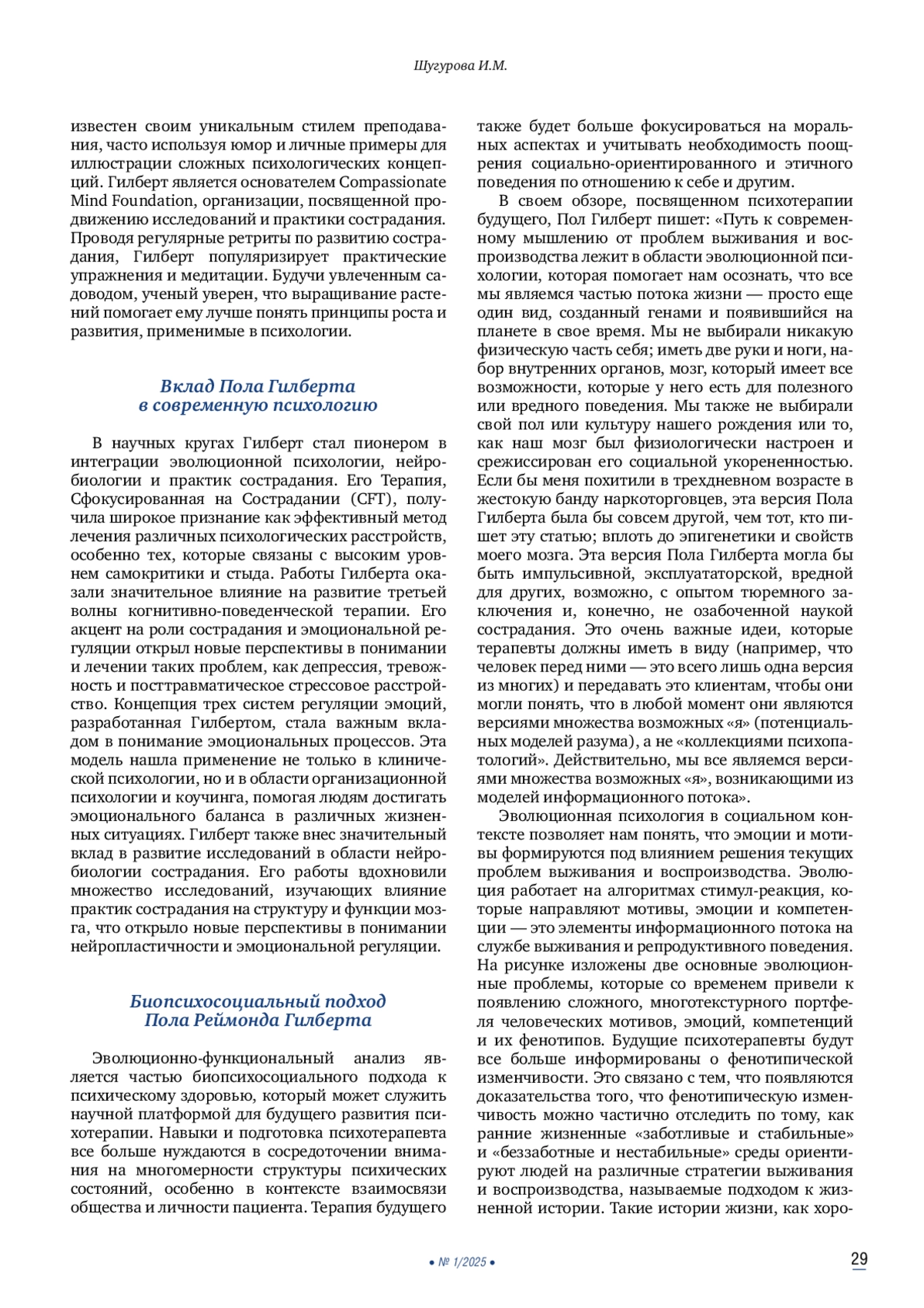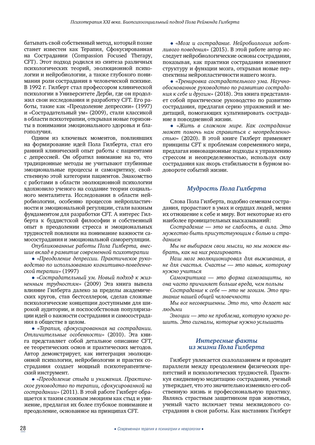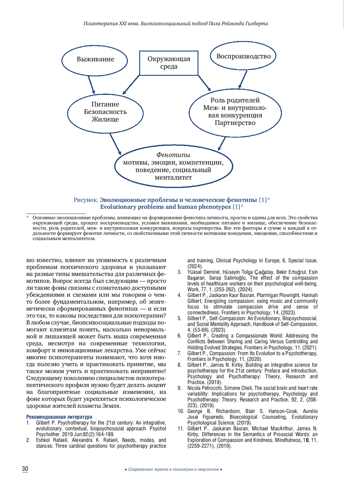 Пол Реймонд Гилберт — ныне здравствующий британский клинический психолог, основатель психотерапии, ориентированной на сострадание. В 2019 г. в журнале «Психология и психотерапия» был опубликован обзор «Психотерапия для 21 века: интегративный, эволюционный, контекстный, биопсихосоциальный подход». В этом обзоре Пол Гилберт воссоздал многоплановый этюд жизни отдельного человека и человечества в целом в контексте психологических проблем, с которыми мы сталкиваемся, наметив единственно возможный путь преодоления этих проблем. И этот единственный путь — интегративный, эволюционный, контекстный, биопсихосоциальный подход к психологии и психотерапии. Предложенный Гилбертом подход исключает любую фрагментацию процессов терапевтических вмешательств, называя это бичом психотерапии. И предлагает взамен создание единой базовой структуры для интеграции знаний для индивидуально ориентированной и эволюционно обоснованной современной эффективной психотерапии XXI века.