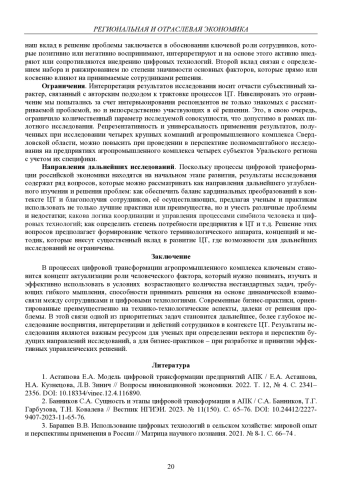 1. Асташова Е.А. Модель цифровой трансформации предприятий АПК / Е.А. Асташова, Н.А. Кузнецова, Л.В. Зинич // Вопросы инновационной экономики. 2022. Т. 12, № 4. С. 2341-2356. DOI: 10.18334/vinec.12.4.116890 EDN: NVSISE