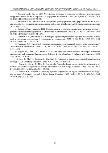 8. Неганова В.П. Цифровой потенциал компании: комплексный подход к его реализации // Экономика и управление. 2023. Т. 29, № 12. С. 1491-1498. DOI: 10.35854/1998-1627-2023-12-1491-1498 EDN: HOMXRA