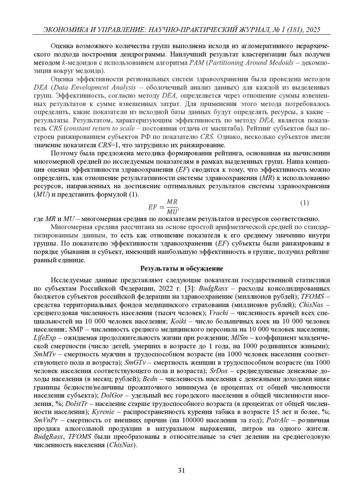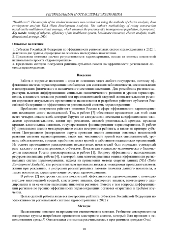 В статье рассматриваются вопросы построения рейтинга субъектов Российской Федерации по эффективности региональных систем здравоохранения, что является актуальным в рамках национального проекта «Здравоохранение». Анализ исследуемых показателей проведен методами кластерного анализа, оболочечного анализа данных DEA (Data Envelopment Analysis). Предложена авторская методика построения рейтинга на основе многомерной средней, которая предполагает наличие однородной совокупности.