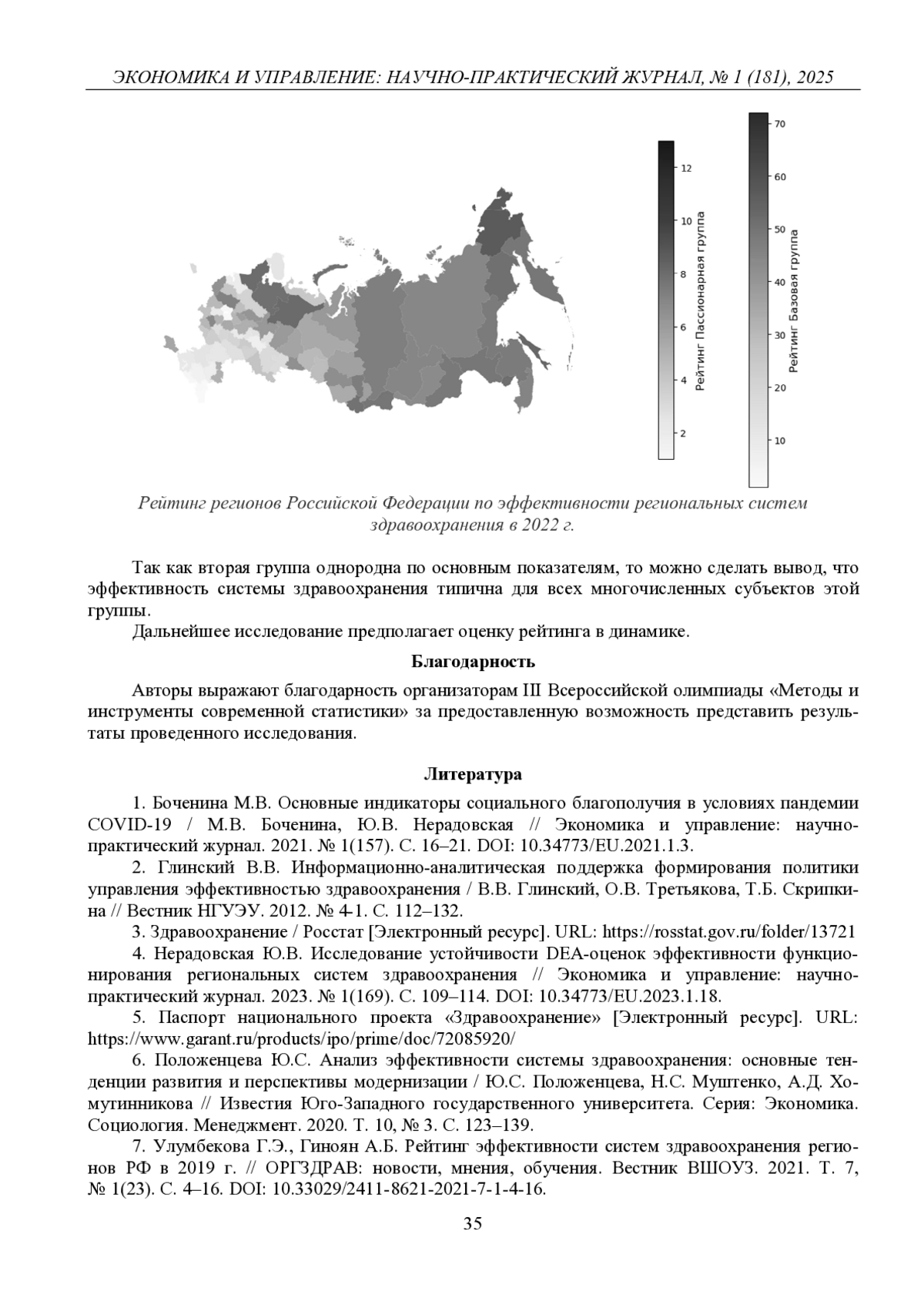4. Нерадовская Ю.В. Исследование устойчивости DEA-оценок эффективности функционирования региональных систем здравоохранения // Экономика и управление: научно-практический журнал. 2023. № 1(169). С. 109-114. DOI: 10.34773/EU.2023.1.18