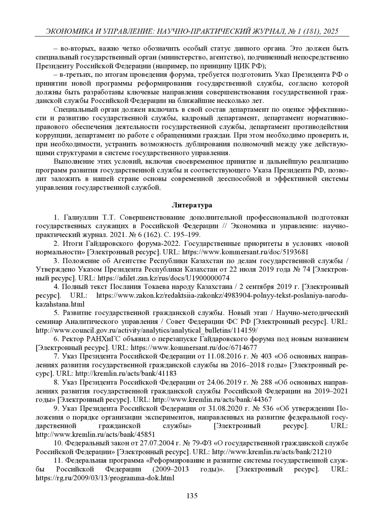 1. Галиуллин Т.Т. Совершенствование дополнительной профессиональной подготовки государственных служащих в Российской Федерации // Экономика и управление: научно-практический журнал. 2021. № 6 (162). С. 195-199.