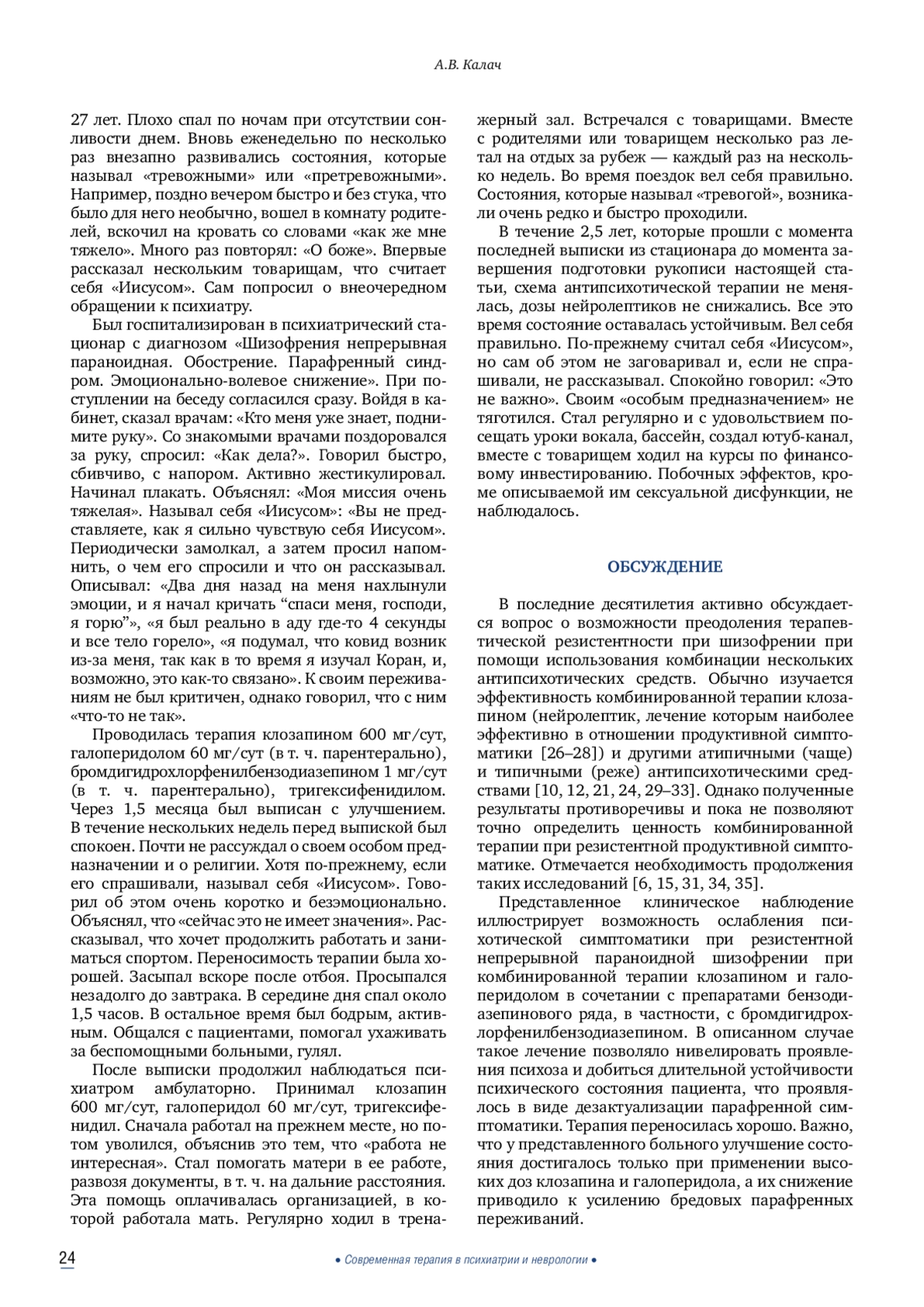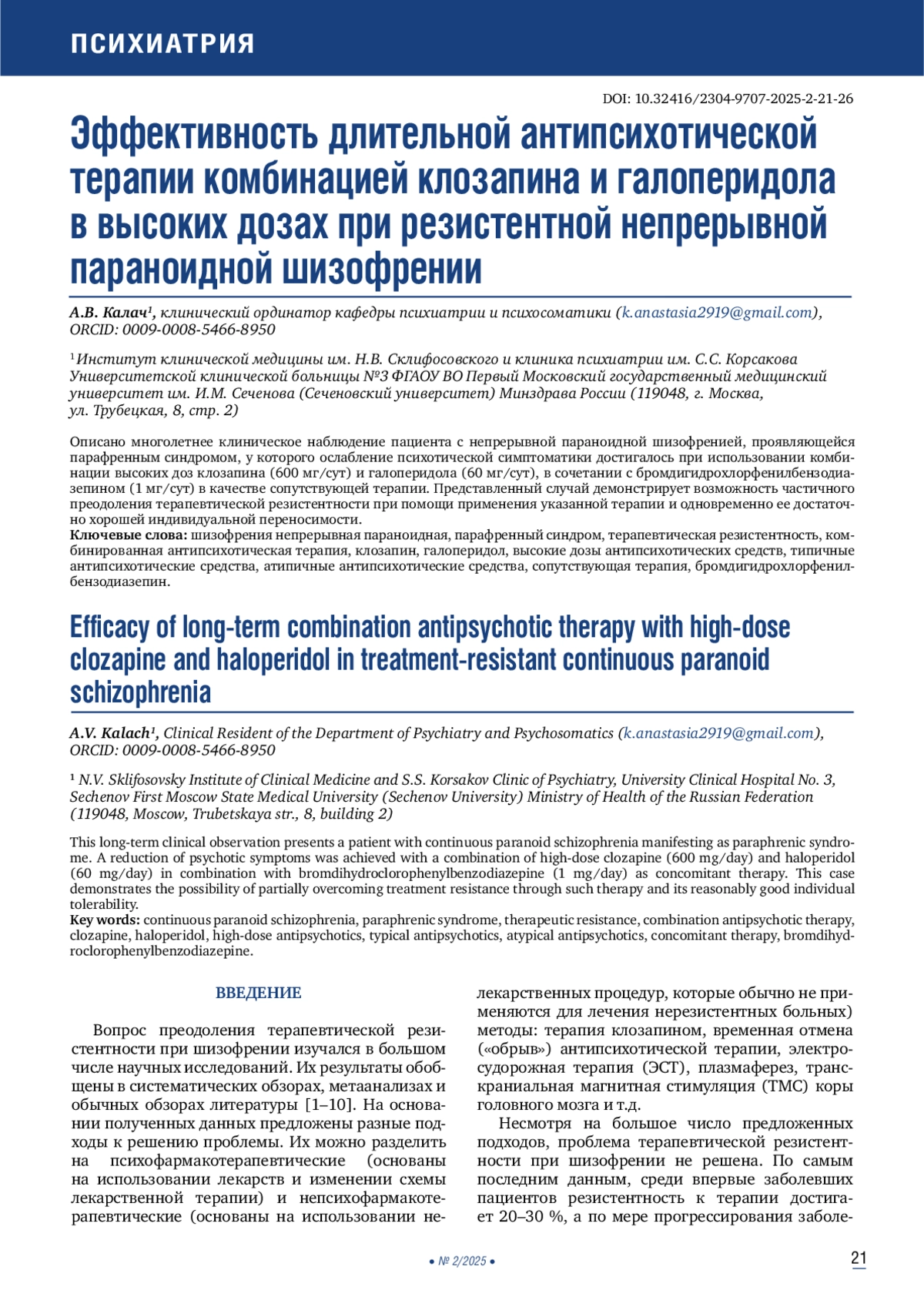 Описано многолетнее клиническое наблюдение пациента с непрерывной параноидной шизофренией, проявляющейся парафренным синдромом, у которого ослабление психотической симптоматики достигалось при использовании комбинации высоких доз клозапина (600 мг/сут) и галоперидола (60 мг/сут), в сочетании с бромдигидрохлорфенилбензодиазепином (1 мг/сут) в качестве сопутствующей терапии. Представленный случай демонстрирует возможность частичного преодоления терапевтической резистентности при помощи применения указанной терапии и одновременно ее достаточно хорошей индивидуальной переносимости.