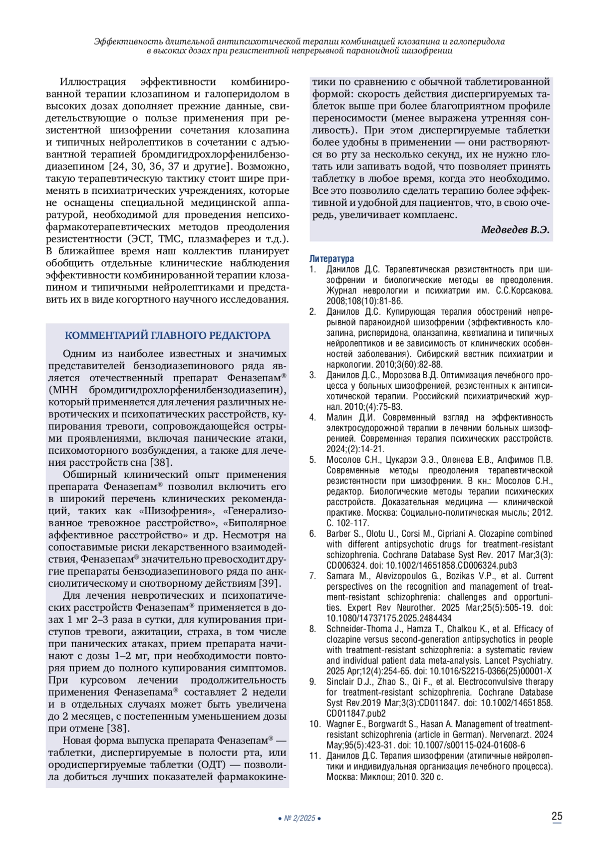 3. Данилов Д.С., Морозова В.Д. Оптимизация лечебного процесса у больных шизофренией, резистентных к антипсихотической терапии. Российский психиатрический журнал. 2010;(4):75-83.