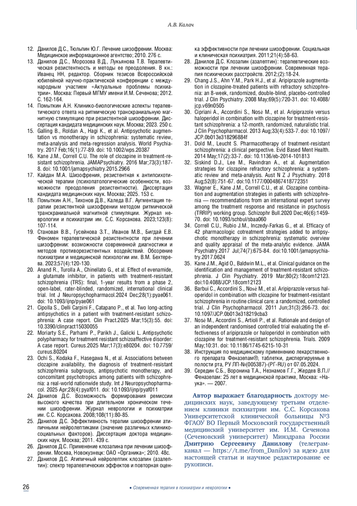27. Данилов Д.С. Атипичный нейролептик клозапин (азалептин): спектр терапевтических эффектов и повторная оценка эффективности при лечении шизофрении. Социальнаяиклиническаяпсихиатрия. 2011;21(4):58-63.