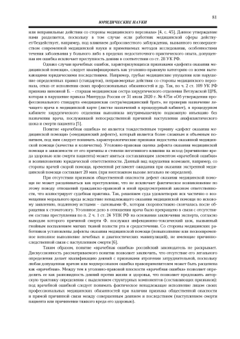 Аргументируя сложность и дискуссионность проблемы определения «врачебная ошибка», автор отдельное внимание обращает на ее соотношение с фактическим «дефектом оказания медицинской помощи». Итогом проведенного теоретического исследования явилась предложенная интерпретация категории «врачебная ошибка» с позиции уголовно-правового аспекта.
