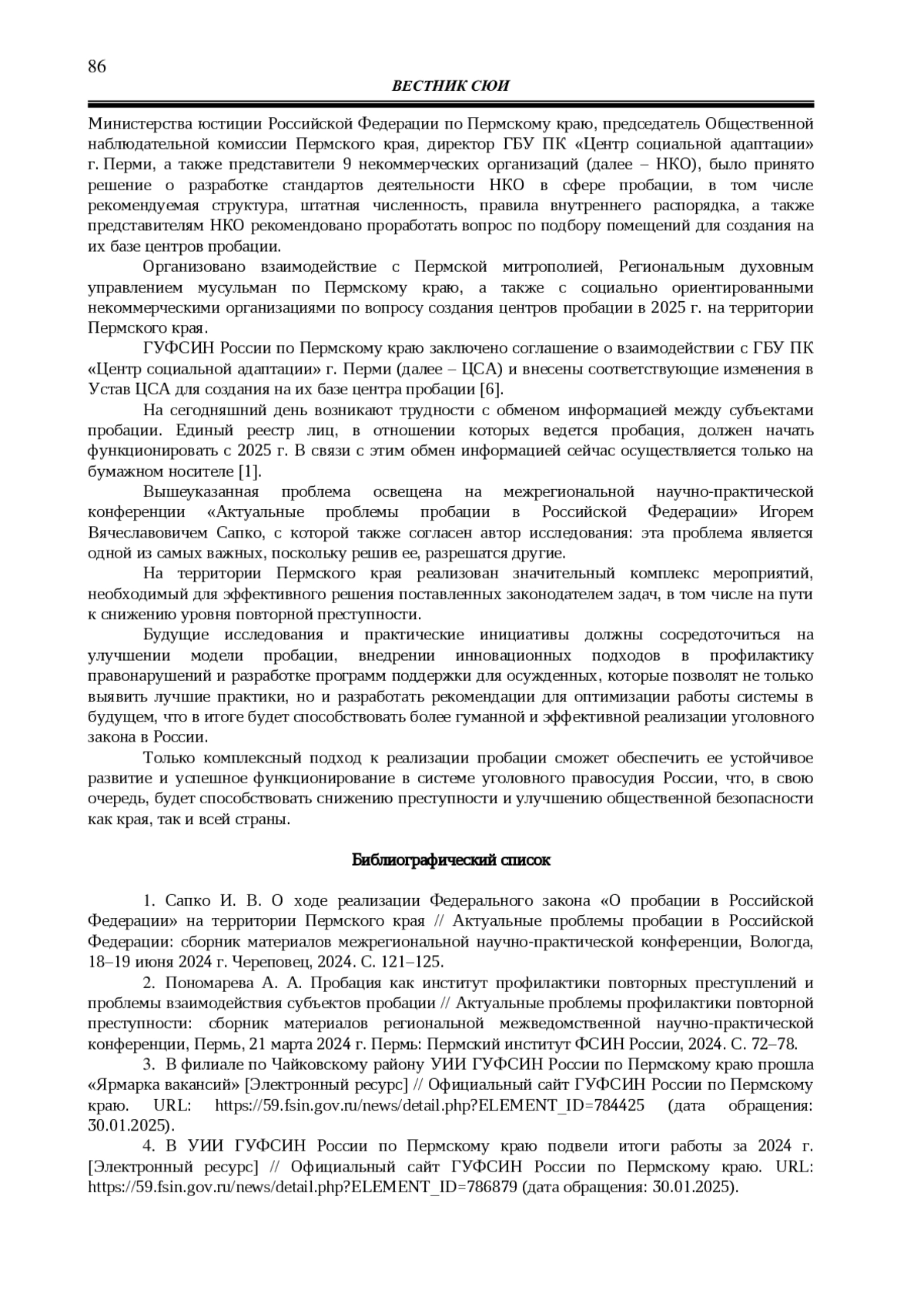 2. Пономарева А. А. Пробация как институт профилактики повторных преступлений и проблемы взаимодействия субъектов пробации // Актуальные проблемы профилактики повторной преступности: сборник материалов региональной межведомственной научно-практической конференции, Пермь, 21 марта 2024 г. Пермь: Пермский институт ФСИН России, 2024. С. 72-78. EDN: EFEUTP