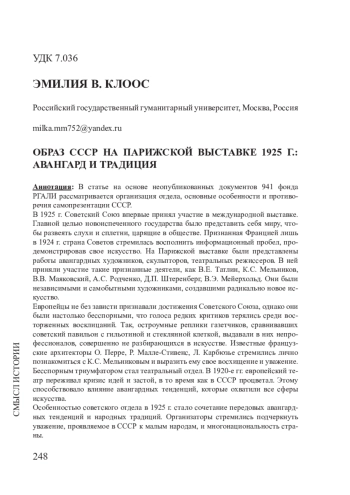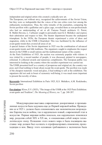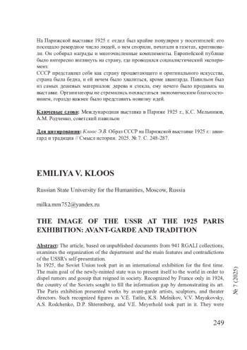 КЛООС Э. В. ОБРАЗ СССР НА ПАРИЖСКОЙ ВЫСТАВКЕ 1925 Г.: АВАНГАРД И ТРАДИЦИЯ // СМЫСЛ ИСТОРИИ. 2025. № 7