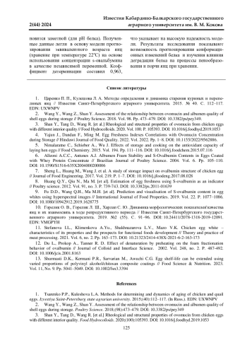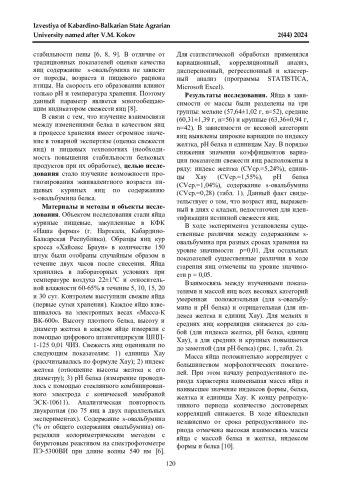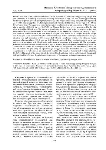 Статья: ОПРЕДЕЛЕНИЕ КАЧЕСТВА ПИЩЕВЫХ КУРИНЫХ ЯИЦ В ПРОЦЕССЕ ХРАНЕНИЯ ПО ИЗМЕНЕНИЮ СОСТОЯНИЯ ОВАЛЬБУМИНА (2024)