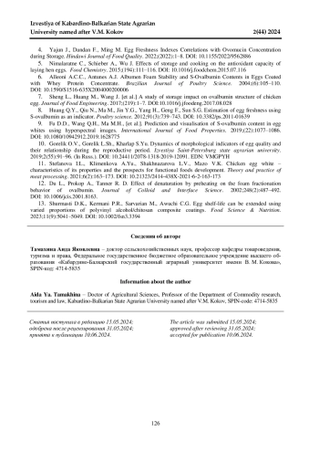 ТАМАХИНА А. Я. ОПРЕДЕЛЕНИЕ КАЧЕСТВА ПИЩЕВЫХ КУРИНЫХ ЯИЦ В ПРОЦЕССЕ ХРАНЕНИЯ ПО ИЗМЕНЕНИЮ СОСТОЯНИЯ ОВАЛЬБУМИНА // ИЗВЕСТИЯ КАБАРДИНО-БАЛКАРСКОГО ГОСУДАРСТВЕННОГО АГРАРНОГО УНИВЕРСИТЕТА ИМ. В. М. КОКОВА. 2024. № 2 (44)