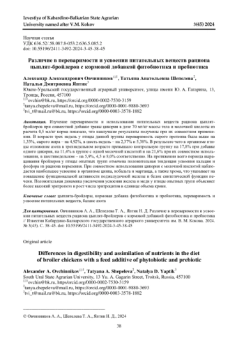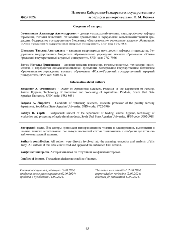10. Рахматуллин Ш. Г., Нуржанов Б. С., Дускаев Г. К. Влияние различных доз растительного экстракта на переваримость рациона, убойные показатели, конверсию веществ в съедобную часть тушки птицы // Вестник Красноярского ГАУ. 2023. № 8. С.149-157. 10.36718/1819-4036- 2023-8-149-157. DOI: 10.36718/1819-4036-2023-8-149-157 EDN: PSXDBT