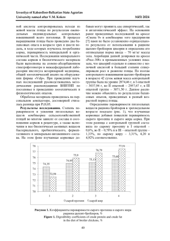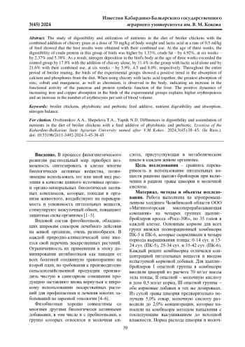 Изучение переваримости и использования питательных веществ рациона цыплятбройлеров при совместной добавке травы цикория в дозе 70 мг/кг массы тела и молочной кислоты из расчета 0,5 мл/кг корма показало, что наилучшие результаты получены при их совместном применении. В возрасте трех недель у птицы данной группы переваримость сырого протеина была выше на 1,33%, сырого жира - на 4,92%, в шесть недель - на 2,37% и 5,38%. В результате чего в организме птицы отложение азота в трехнедельном возрасте превышало контрольную группу на 17,8% при добавке одного цикория, на 11,4% в группе с одной молочной кислотой и на 21,6% при их совместном использовании, в шестинедельном - на 5,9%, 4,5 и 8,0% соответственно. На протяжении всего периода выращивания бройлеров у птицы опытных групп отмечена положительная тенденция усвоения кальция и фосфора из рациона кормления. При совместном использовании цикория с молочной кислотой наблюдается наибольшее усвоение в организме цинка, кобальта и марганца, а также хрома, что указывает на повышение функциональной активности поджелудочной железы и белок синтетической функции печени. Положительная динамика увеличения усвоения железа и меди у птицы опытных групп объясняет более высокий эритропоэз и рост числа эритроцитов в единице объема крови.
