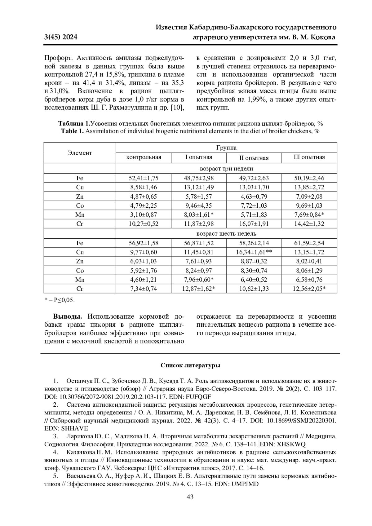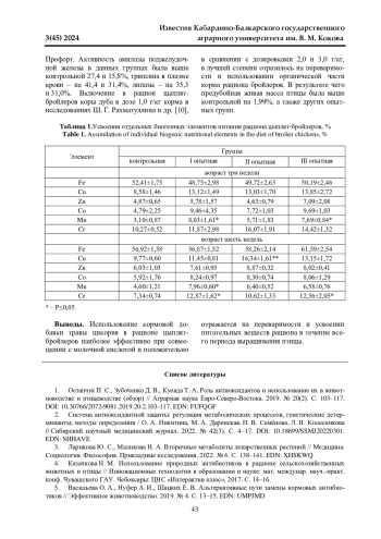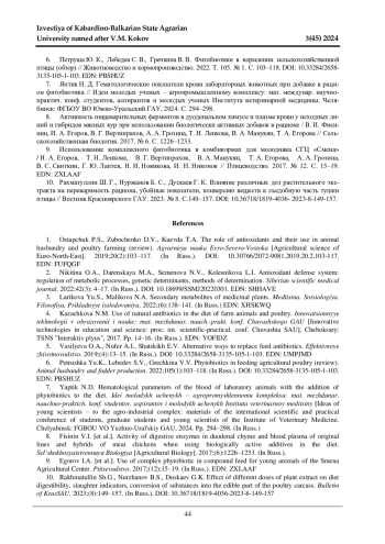 1. Остапчук П. С., Зубоченко Д. В., Куевда Т. А. Роль антиоксидантов и использование их в животноводстве и птицеводстве (обзор) // Аграрная наука Евро-Северо-Востока. 2019. № 20(2). С. 103-117. DOI: 10.30766/2072-9081.2019.20.2.103-117 EDN: FUFQGF