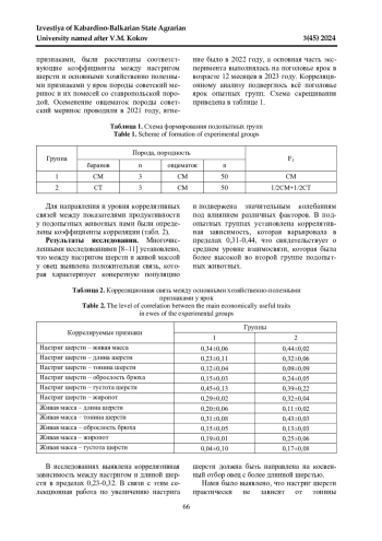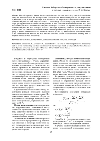 В статье приведены данные о взаимосвязи основных признаков продуктивности у овец породы советский меринос и их помесей со ставропольской породой. Сопряженность настрига шерсти с живой массой в подопытных группах находится на среднем уровне и варьировала в интервале 0,31-0,44. Выявлена несущественная или слабая взаимосвязь настрига шерсти с длиной шерсти 0,23-0,32. Соответственно, необходимо обращать внимание на длину шерсти, отдавая предпочтение животным с более длинной шерстью. Слабая корреляционная зависимость наблюдалась между настригом шерсти и тониной (r=0,09-0,12) и между настригом шерсти и оброслостью брюха 0,15-0,24. Наиболее высокая корреляционная связь наблюдается между настригом шерсти и густотой шерсти (0,39-0,45). Живая масса положительно коррелирует с длиной шерсти животных, коэффициенты корреляции составили в группе чистопородных ярок 0,20, а в группе помесных 0,11. С жиропотом также отмечена положительная связь (0,19-0,25). Установленные уровни и характер взаимосвязей между признаками необходимо принимать во внимание при дефференцированной селекции с акцентом на мясную или шерстную продуктивность.