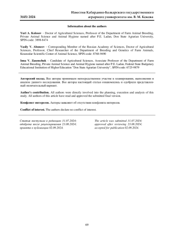 В статье проведен анализ результатов оценки балльным и индексным методами по качеству потомства пяти быков-производителей калмыцкой породы и их сыновей по собственной продуктивности и формированию у них морфологического состава туши. Для этого в ООО Племзавод «Солнечное» Орловского района Ростовской области отобрано по 10 сыновей быков Прометей 1127, Грильяж 916, Гомат ДРЖ-59223, Яго ДРЖ-39023 и Раскат 8692. Сыновья оцениваемых быков-производителей до 8-месячного возраста выращивались на полном подсосе с матерями, а с 8 до 15-месячного возраста содержались в одной группе в равных условиях и за 7-месячный период в среднем на одного бычка потреблено кормов с содержанием 1569 кормовых единиц, 168 кг переваримого протеина, 2032 кг сухого вещества с обменной энергией 15663 МДж. При таком уровне кормления все подконтрольные быки-производители и почти все их сыновья по балльной оценке соответствовали требованиям бонитировочного класса элитарекорд. Однако по результатам индексной оценки только быки Прометей 1127 и Грильяж 916 удовлетворяли требованиям племенной категории улучшатель, а остальные три быка - племенной категории нейтральные. Потомки лидерных быков с предубойной живой массой 412,1 и 419,9 кг превосходили сверстников других групп по массе туши на 8,5-14,1 кг, по массе мышечной ткани на 9,4-15,4 кг, но на 3-5% меньше выход жира, костей, хрящей и сухожилий и самый высокий коэффициент мясности.