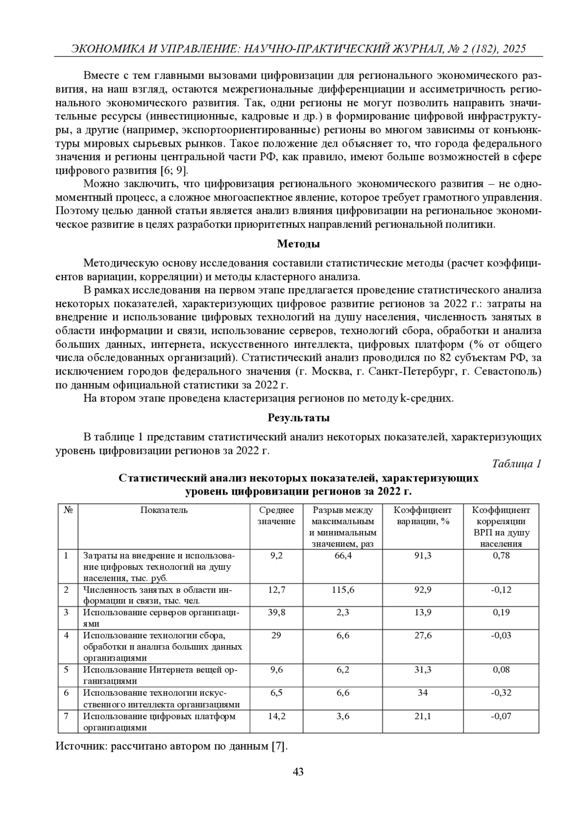 Цифровизация региона предполагает массовое внедрение цифровых технологий во все сферы экономики, что может оказывать как положительное, так и отрицательное влияние на региональное экономическое развитие. Большинстве исследователей к ключевым угрозам регионального экономического развития в условиях цифровизации относят риски безработицы и углубление межрегиональных дифференциаций. В статье проведен анализ влияния цифровизации на региональное экономическое развитие. Полученные результаты свидетельствуют о наличии связи между уровнем цифровизации и региональным экономическим развитием