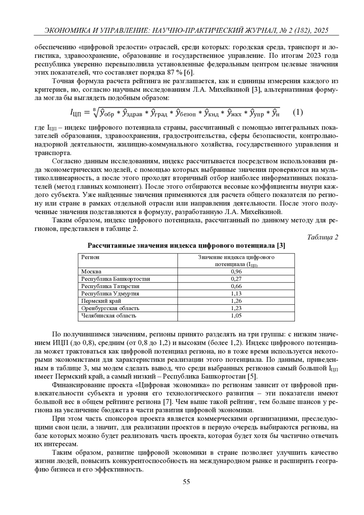 ДУНАЕВА А. С., ХАНАФИЕВА И. Р. АНАЛИЗ ЦИФРОВОГО ПОТЕНЦИАЛА РЕГИОНОВ РОССИЙСКОЙ ФЕДЕРАЦИИ // ЭКОНОМИКА И УПРАВЛЕНИЕ: НАУЧНО-ПРАКТИЧЕСКИЙ ЖУРНАЛ. 2025. № 2 (182)