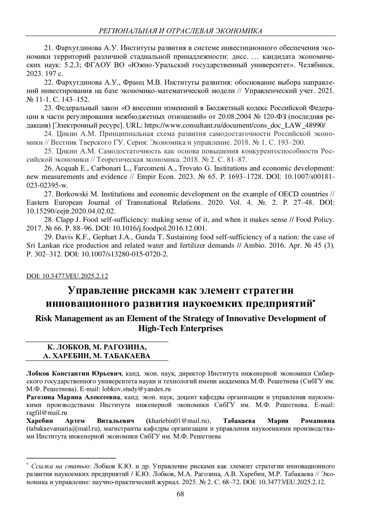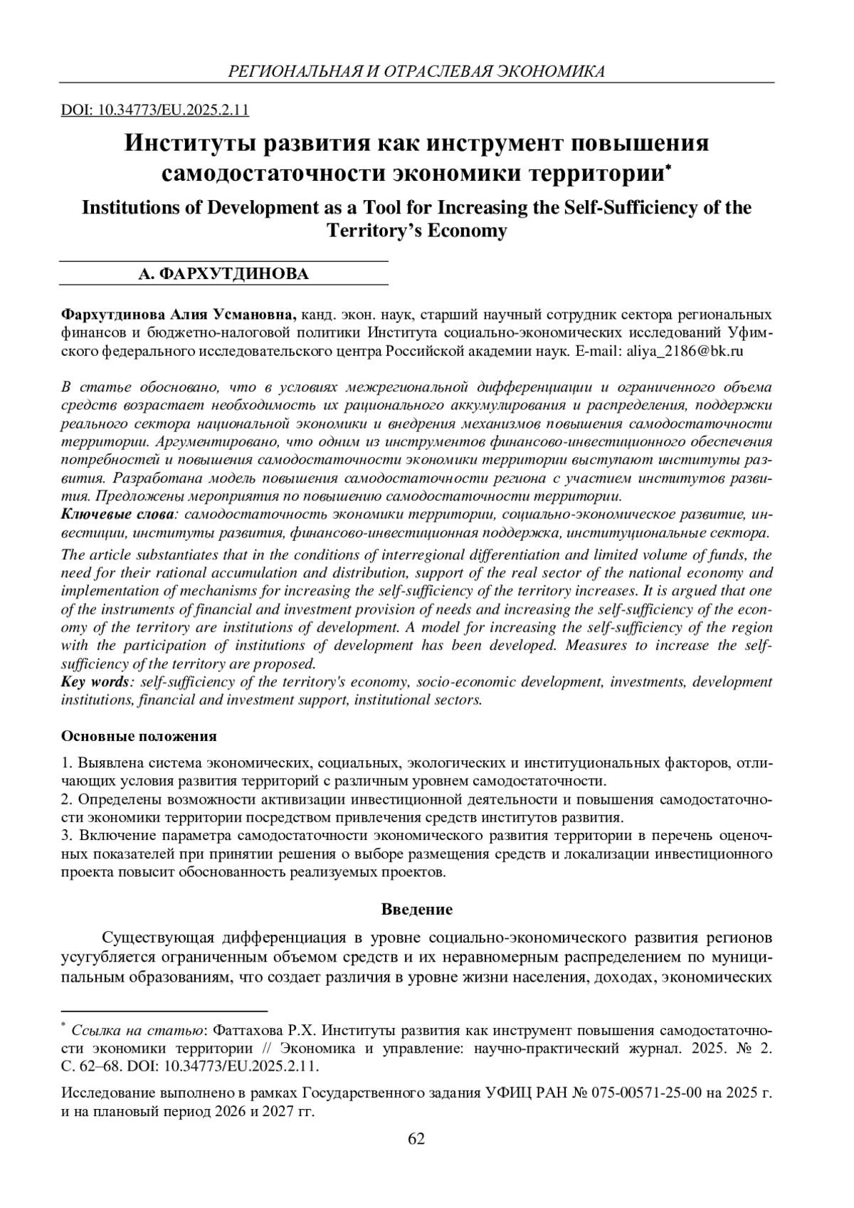 Статья: ИНСТИТУТЫ РАЗВИТИЯ КАК ИНСТРУМЕНТ ПОВЫШЕНИЯ САМОДОСТАТОЧНОСТИ ЭКОНОМИКИ ТЕРРИТОРИИ (2025)