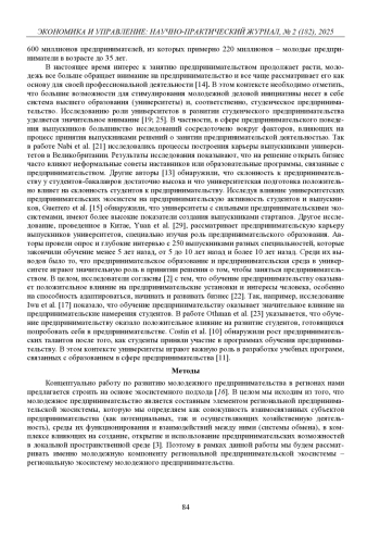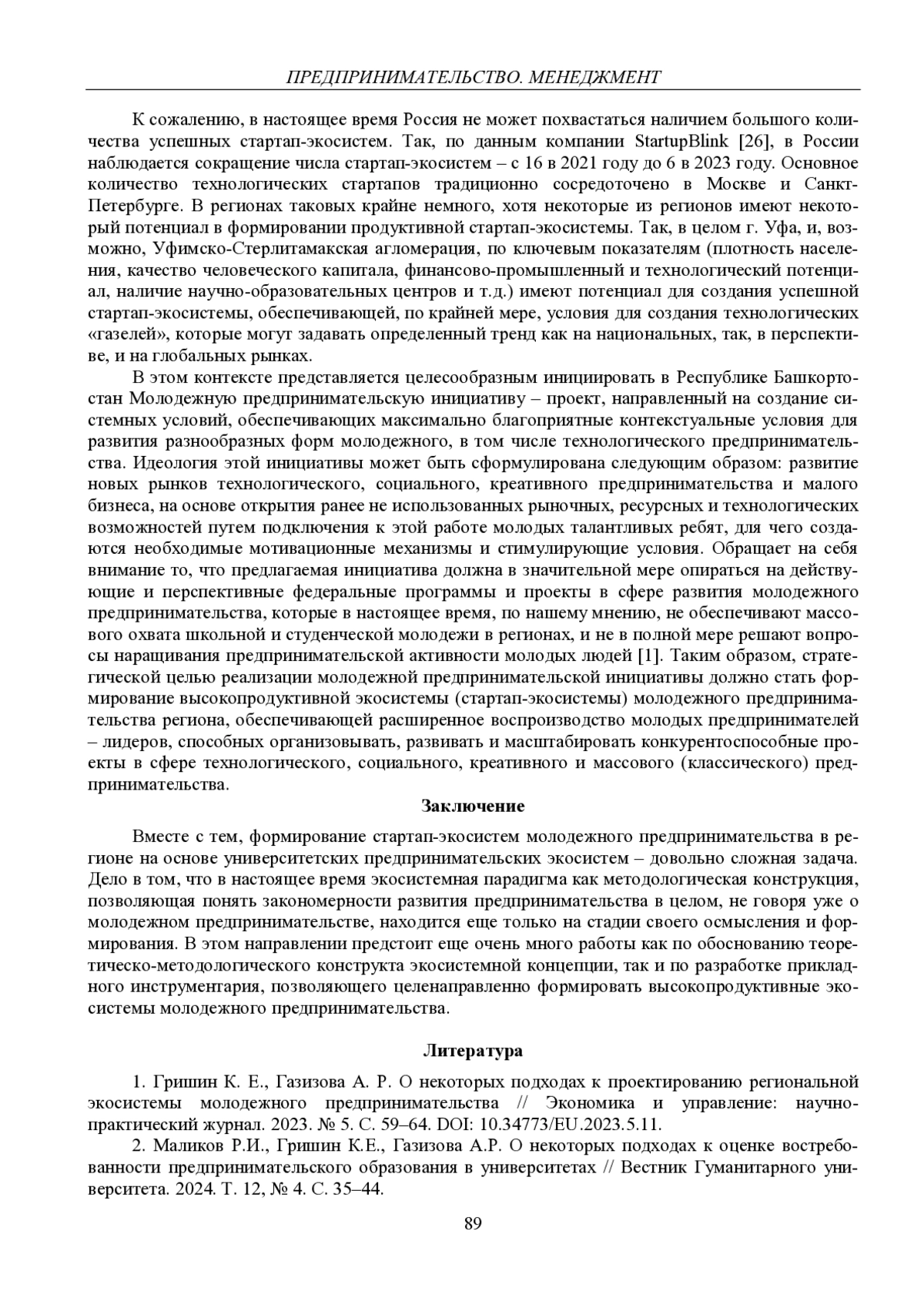 1. 	Гришин К. Е., Газизова А. Р. О некоторых подходах к проектированию региональной экосистемы молодежного предпринимательства // Экономика и управление: научно-практический журнал. 2023. № 5. С. 59-64.  DOI: 10.34773/EU.2023.5.11
