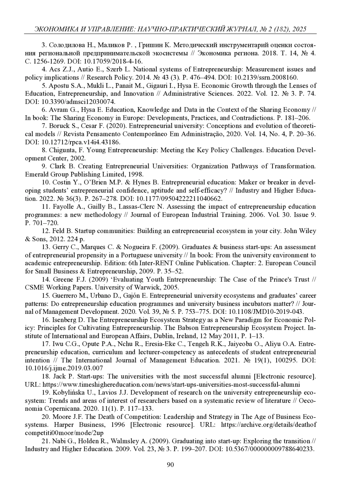 19. 	Kobylińska U., Lavios J.J. Development of research on the university entrepreneurship ecosystem: Trends and areas of interest of researchers based on a systematic review of literature // Oeconomia Copernicana. 2020. 11(1). P. 117-133.
