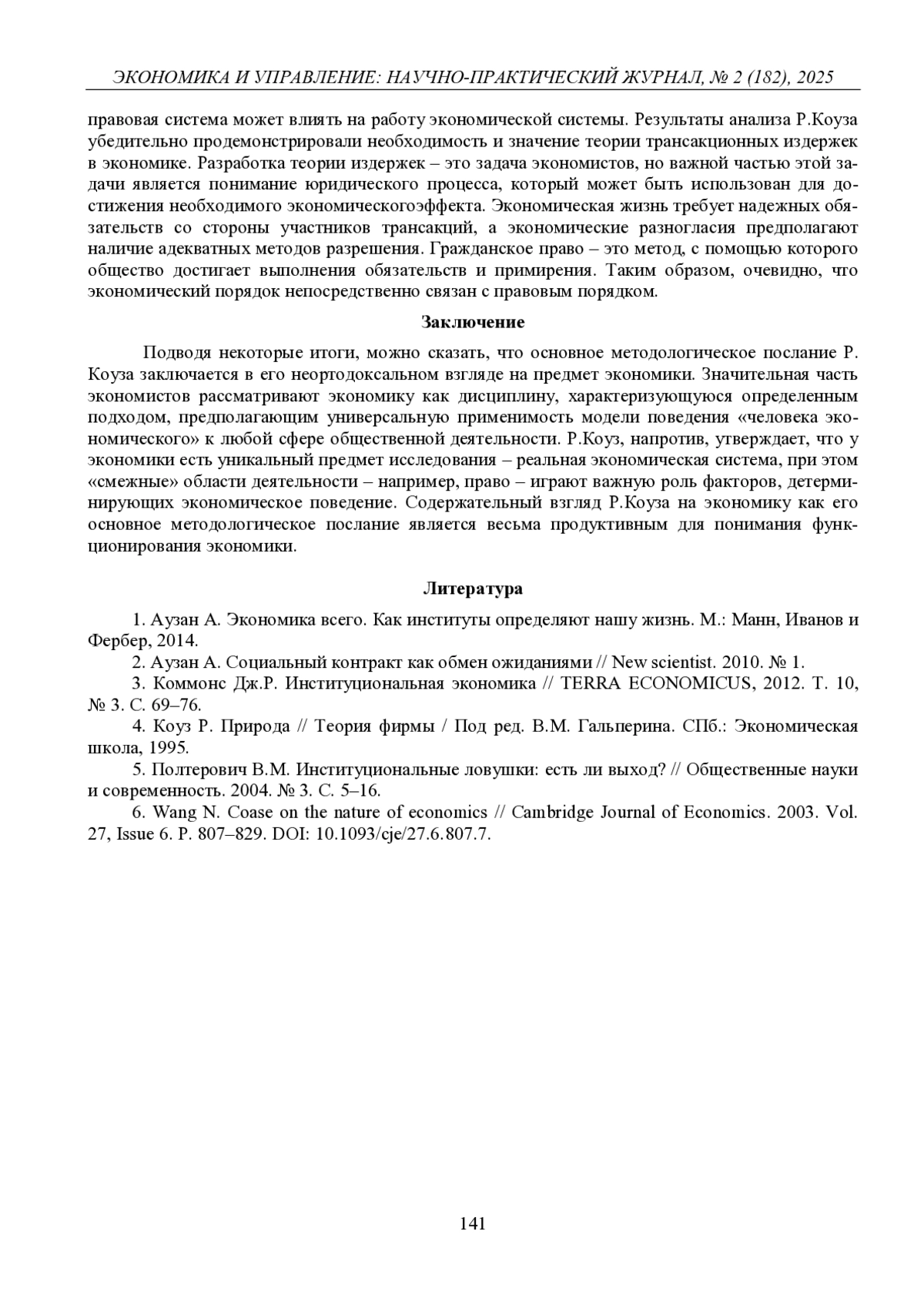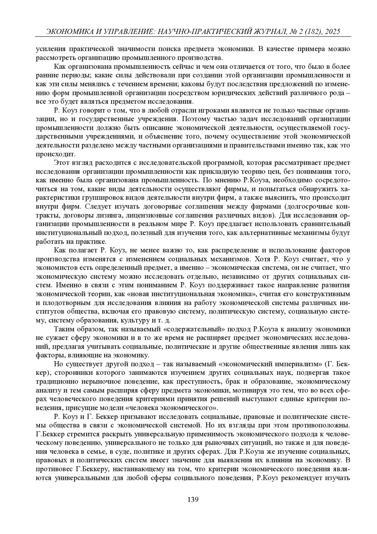 ГАРАЙШИНА Л. Ш. «СОДЕРЖАТЕЛЬНЫЙ» ПОДХОД В ИССЛЕДОВАНИЯХ РОНАЛЬДА КОУЗА // ЭКОНОМИКА И УПРАВЛЕНИЕ: НАУЧНО-ПРАКТИЧЕСКИЙ ЖУРНАЛ. 2025. № 2 (182)