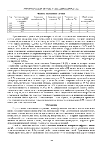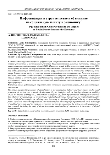 В статье анализируются процессы цифровизации в строительной отрасли и их влияние на социальную защиту работников и экономическое развитие. Рассматриваются ключевые технологии, такие как информационное моделирование зданий (BIM), Интернет вещей (IoT) и искусственный интеллект (ИИ), их внедрение и влияние на эффективность строительства. Проведен экономико-статистический анализ, подтверждающий положительное влияние цифровых технологий на сокращение издержек, повышение безопасности труда и снижение уровня производственного травматизма. Выявлены ключевые проблемы, связанные с цифровизацией, включая высокие затраты на внедрение, дефицит квалифицированных кадров и необходимость государственной поддержки. Предложены направления дальнейших исследований, в том числе изучение экологической устойчивости строительства в условиях цифровой трансформации